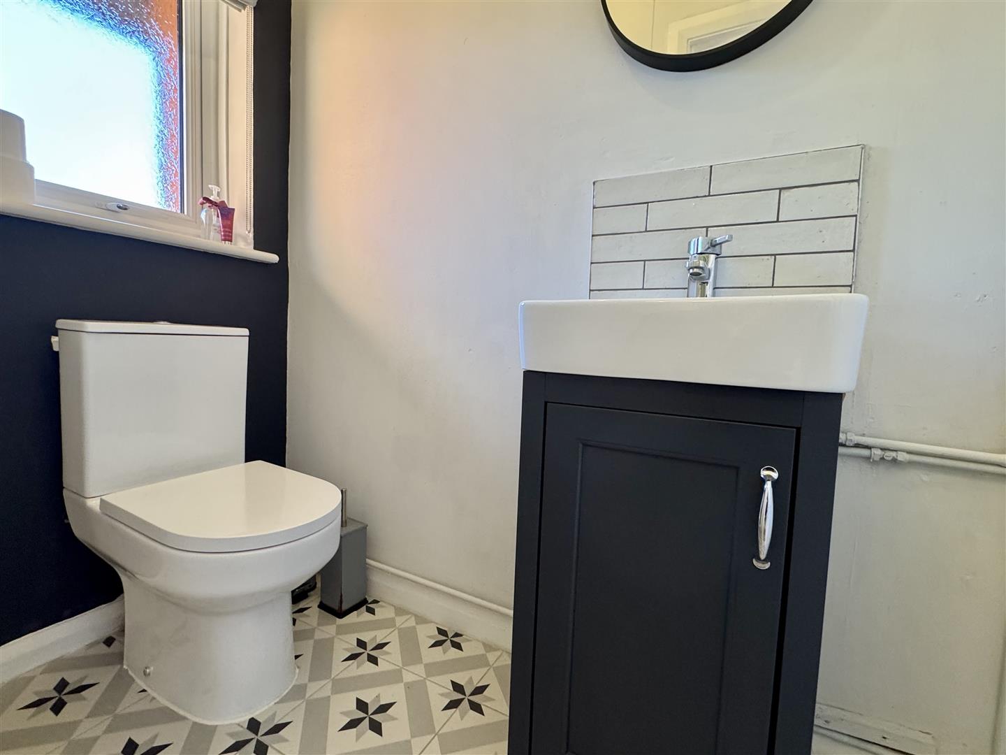 Coved and plain ceiling. Low level W.C. with dual push button flush. Wash hand basin with chrome mixer tap and tile splash back set over vanity storage unit. Tiled floor. Panelled radiator. Opaque UPVC double glazed window to front elevation.