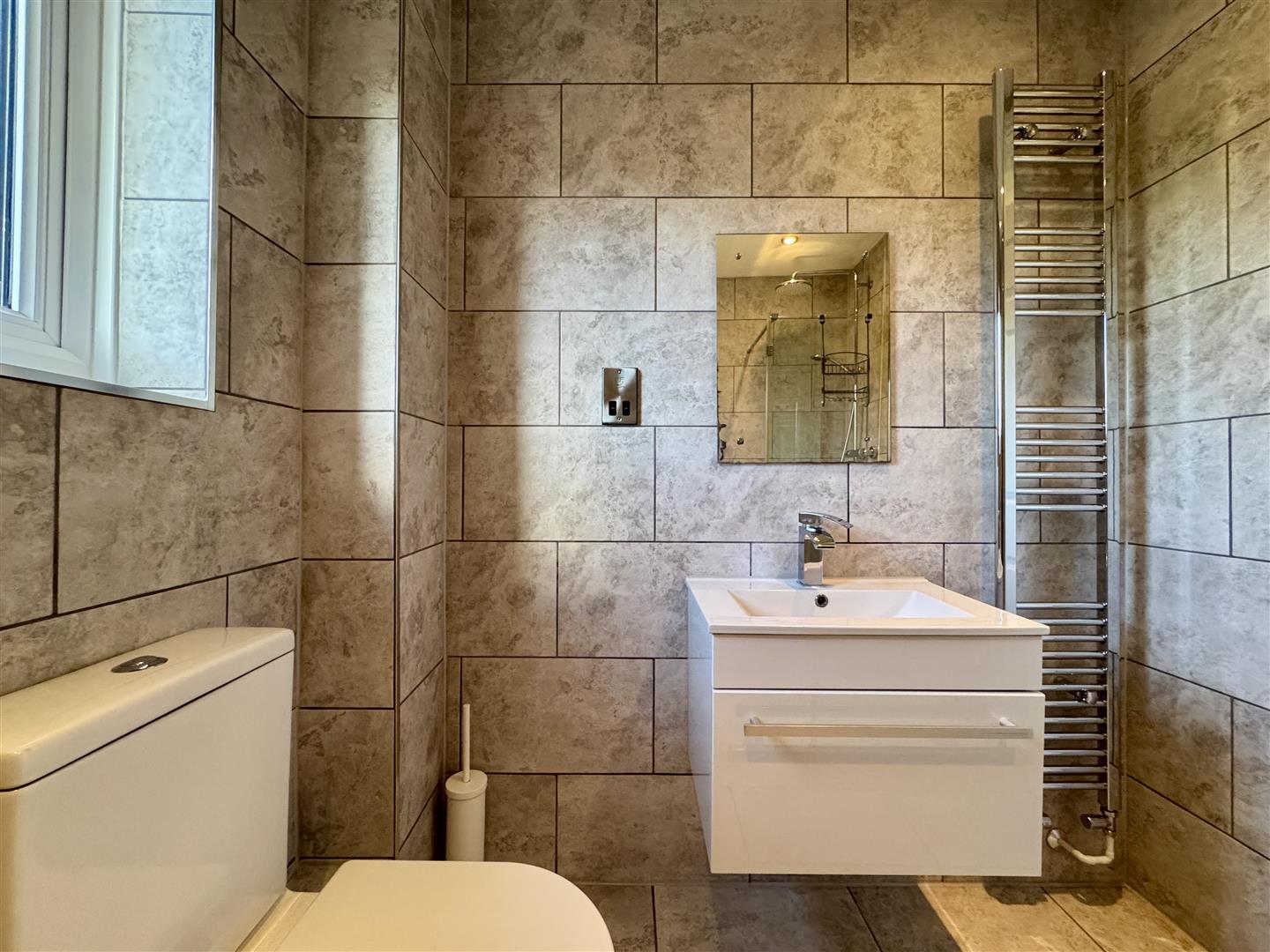Inset spotlighting and extractor to plain ceiling. Low level dual push button flush W.C. Wash hand basin with chrome mixer tap set over drawer unit. Shaver point. Step in enclosure with rainwater head shower and separate shower attachment. Full tiling to walls. Tiled floor. Chrome towel radiator. Opaque UPVC double glazed window to rear elevation.