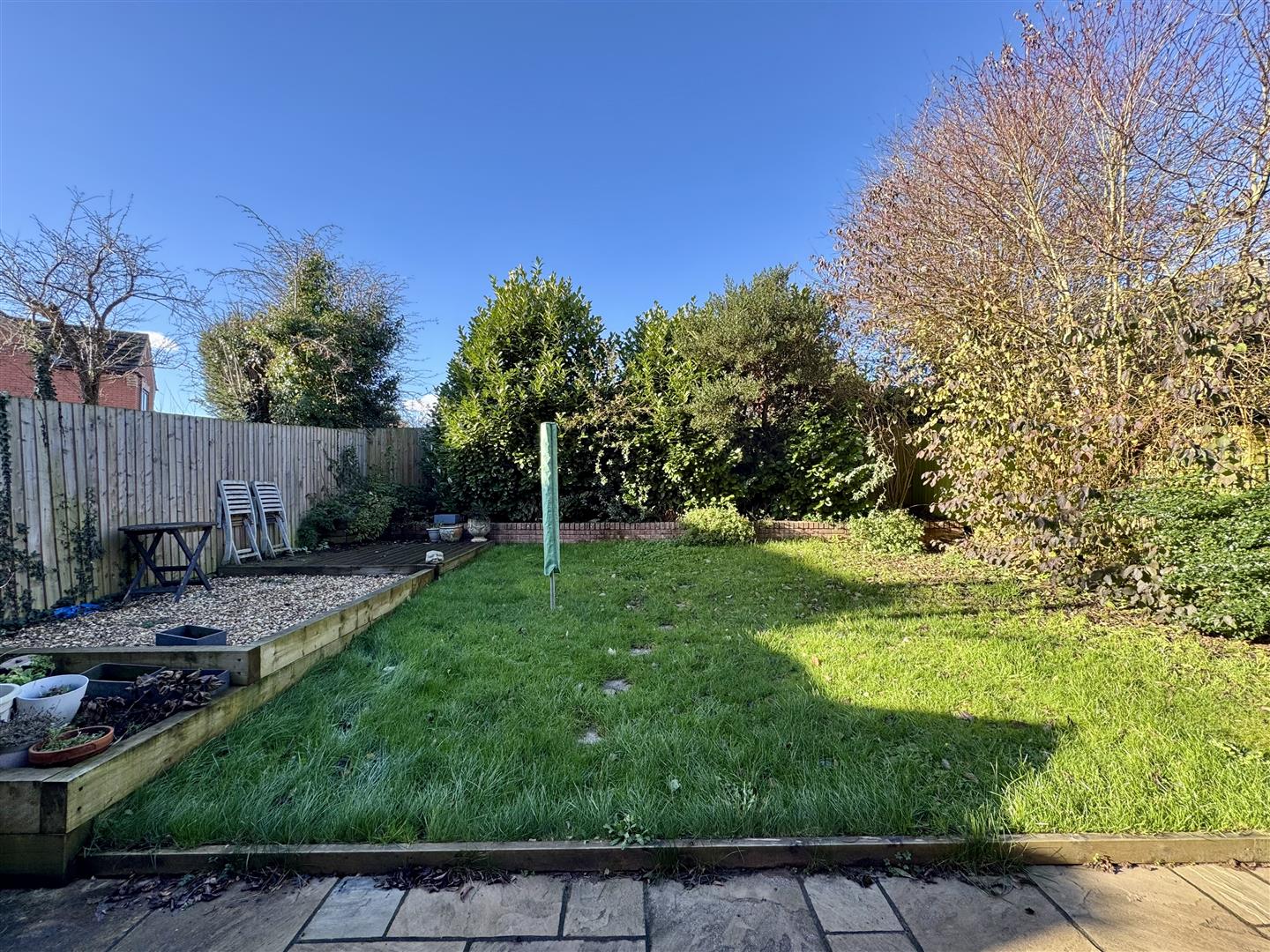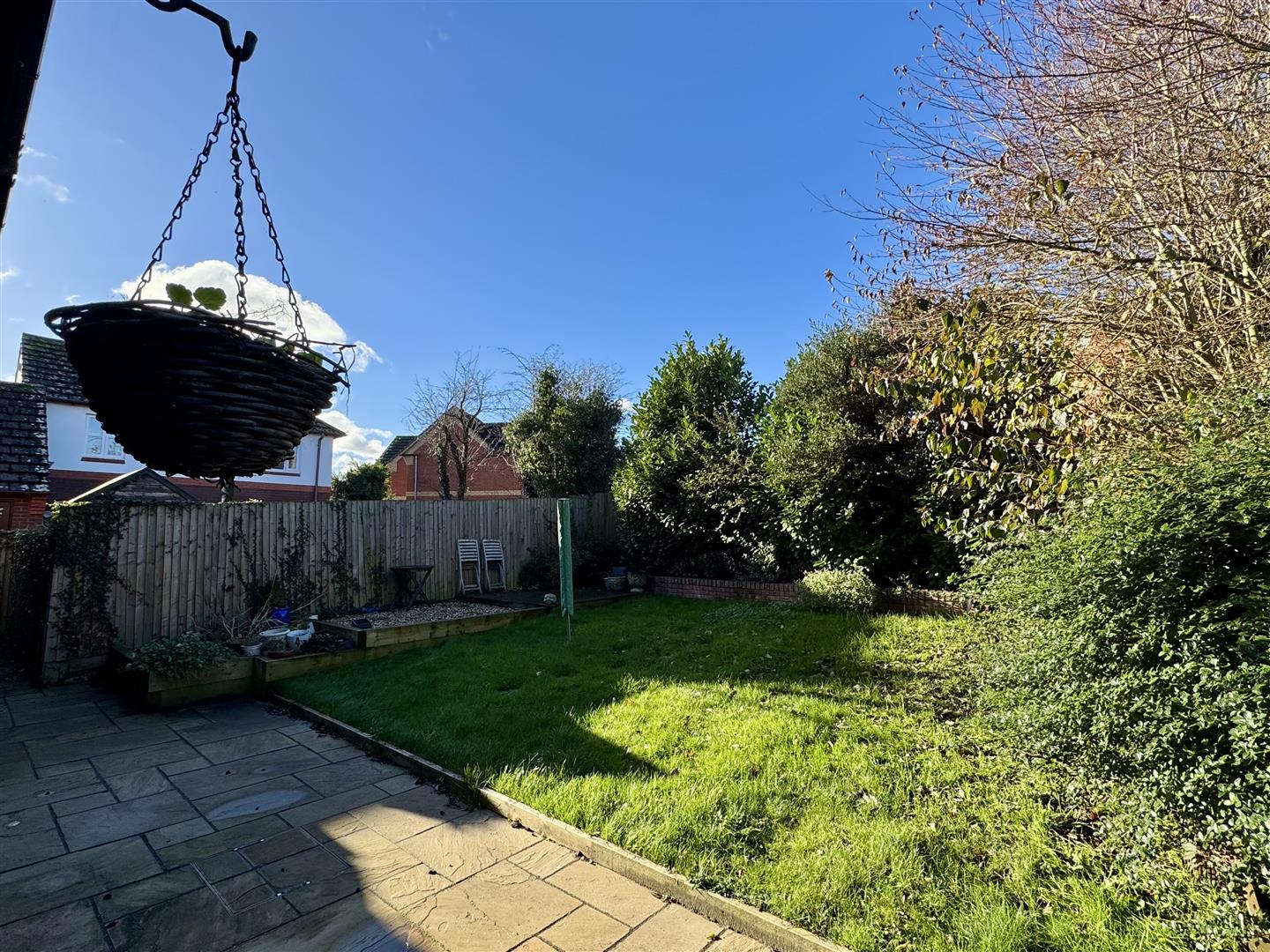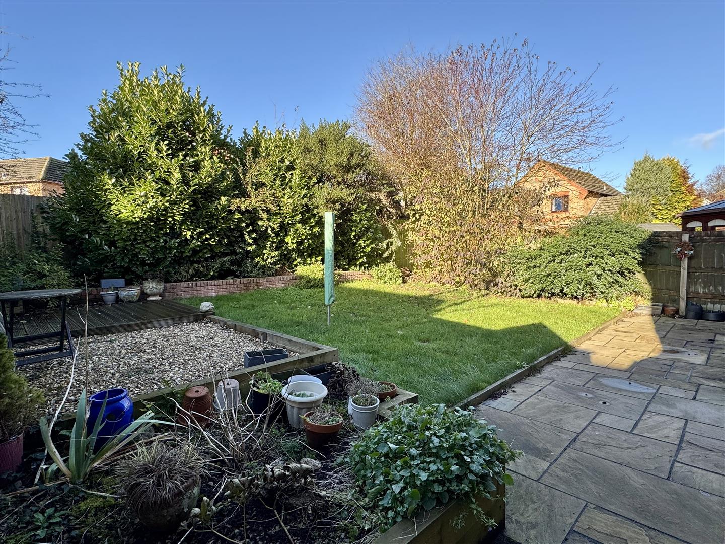 The front of the property features a well-maintained lawn with maturing bushes, shrubs, and trees. A side gate provides access to the landscaped rear garden, which has a full-width paved seating area, raised beds, and a well-kept lawn. Additionally, there is an outside tap. The rear garden enjoys plenty of sunshine and offers a private, peaceful setting.