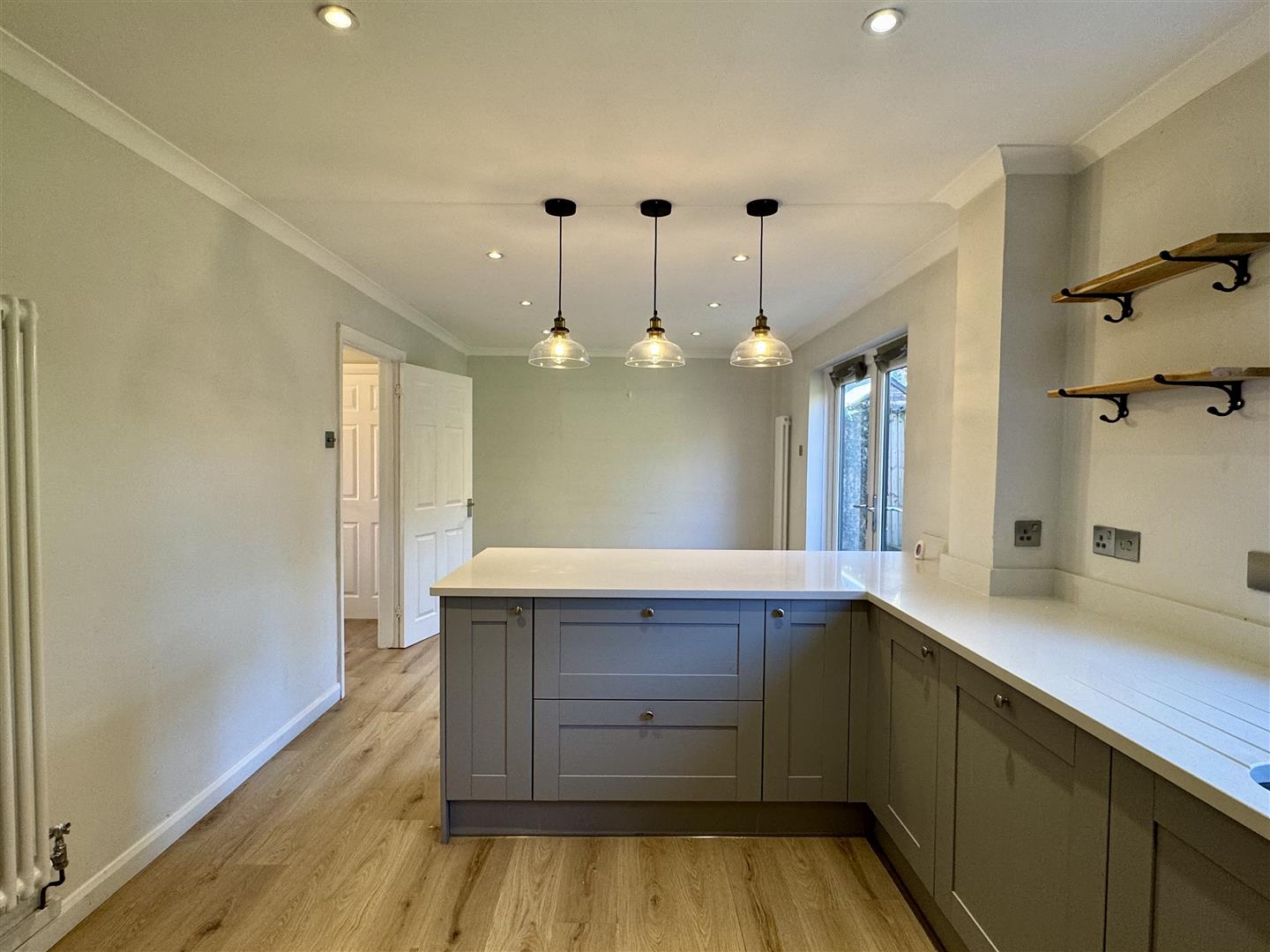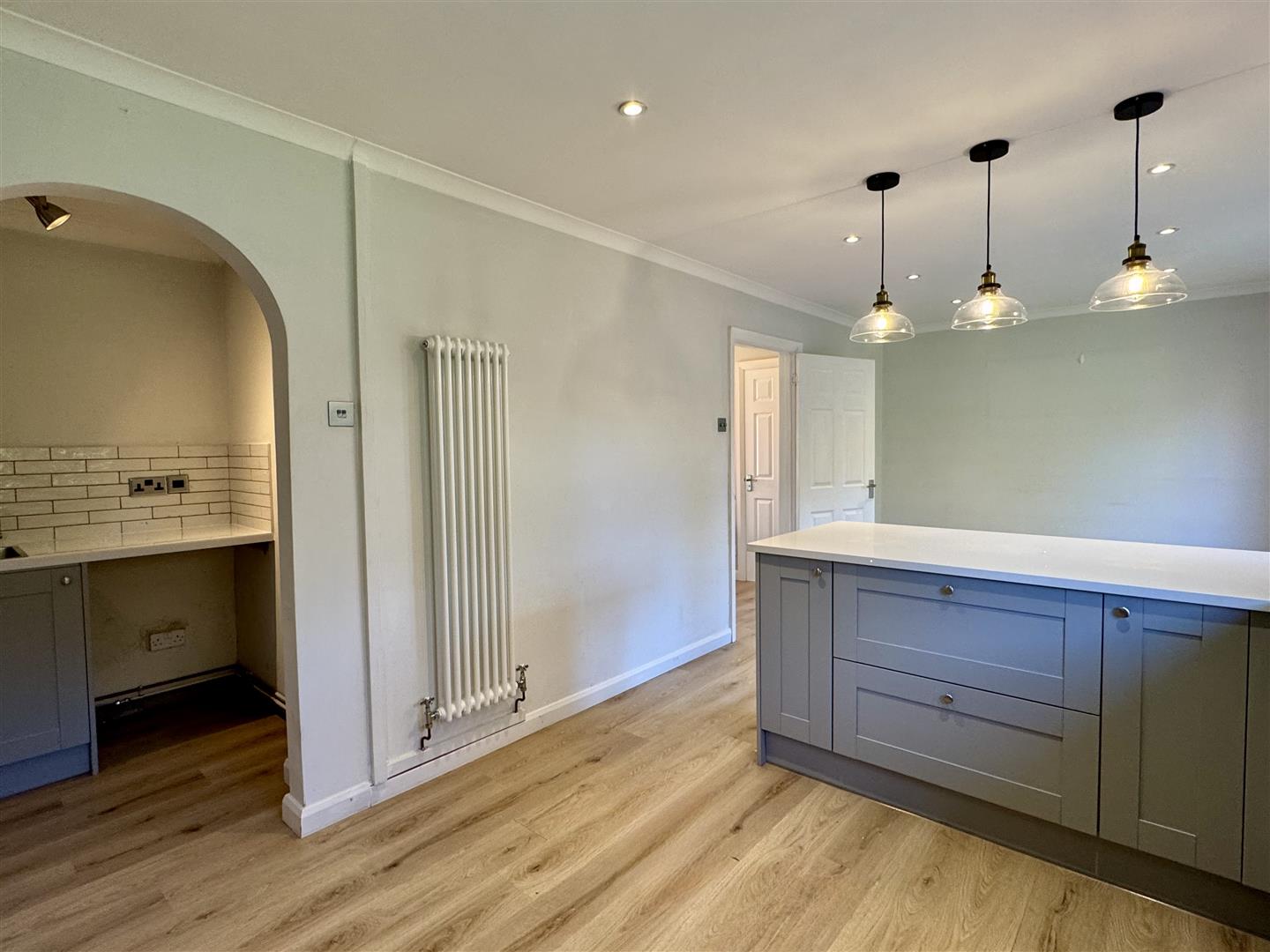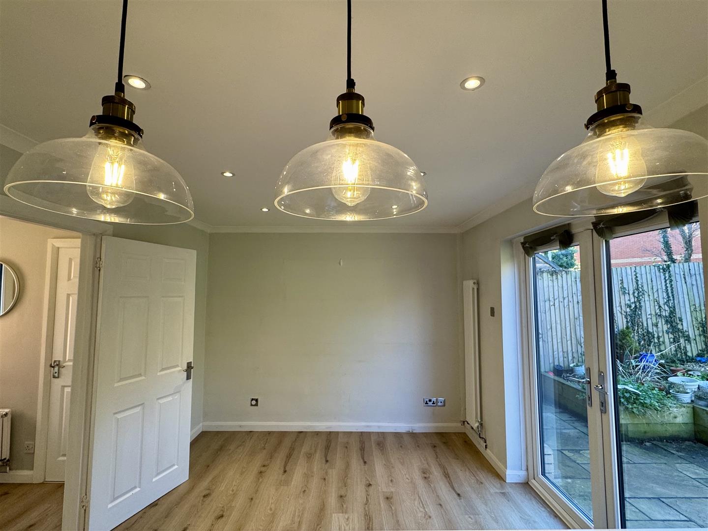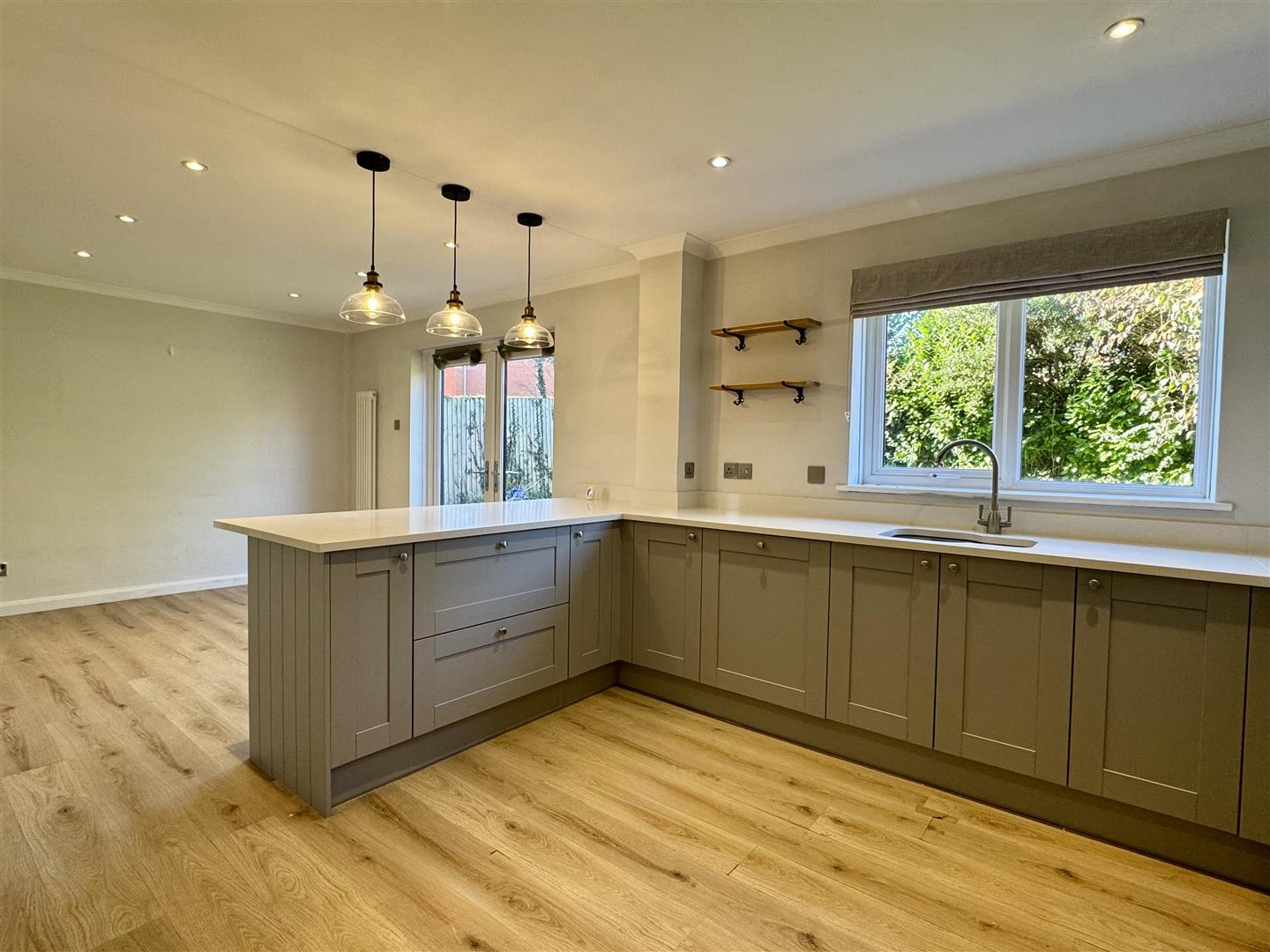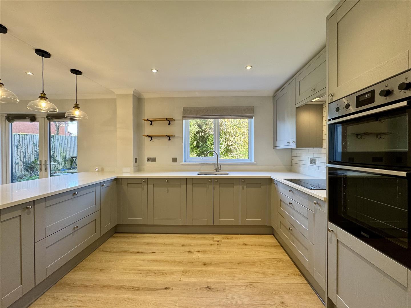 Coved and plain ceiling with inset spotlighting. The kitchen area is fitted with a matching range of contemporary shaker style base and eye level wall units. There are quartz work surfaces with complimentary up stands. One and half bowl stainless steel sink and mixer tap set into work surface. Breakfast bar. Built in fan assisted double electric oven. Four ring touch control electric hob set into work surface. Extractor and light over. Built in fridge freezer. Integrated dishwasher. Wood effect flooring throughout. Two contemporary style radiators. UPVC double glazed window to rear elevation. UPVC double glazed french doors to rear garden. Open to utility room.