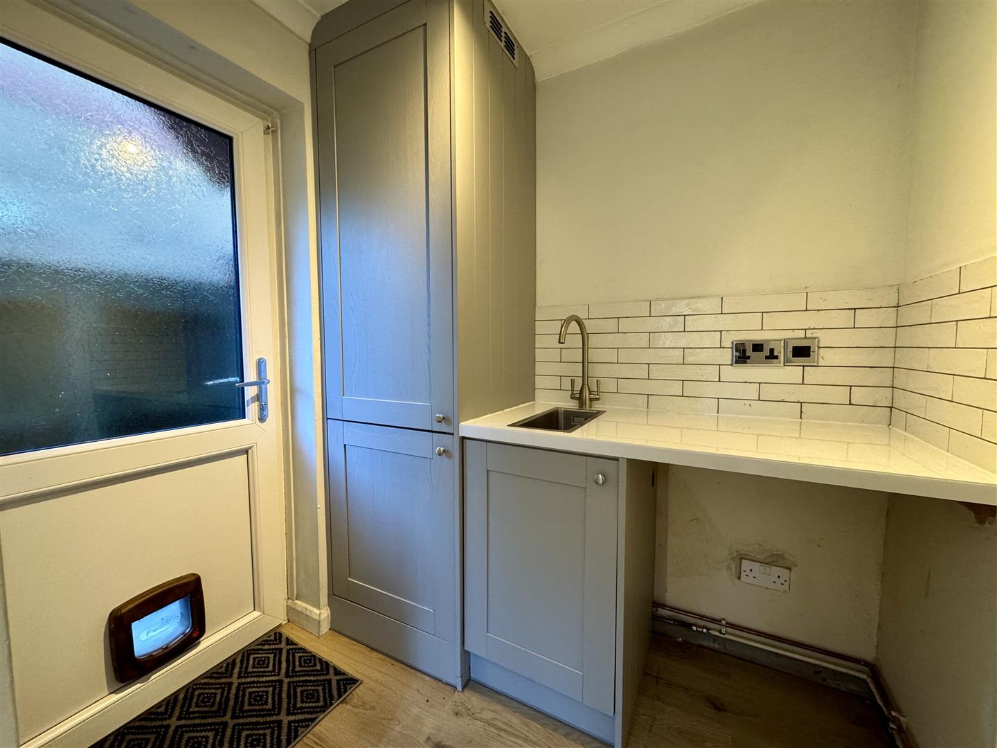 Coved and plain ceiling. Cupboard housing wall mounted mains gas boiler. Sink and mixer tap set into quartz effect work surface with tile splash back. Base storage unit. Plumbing and space for automatic washing machine. Wood effect flooring. UPVC double glazed and panelled door to side elevation.