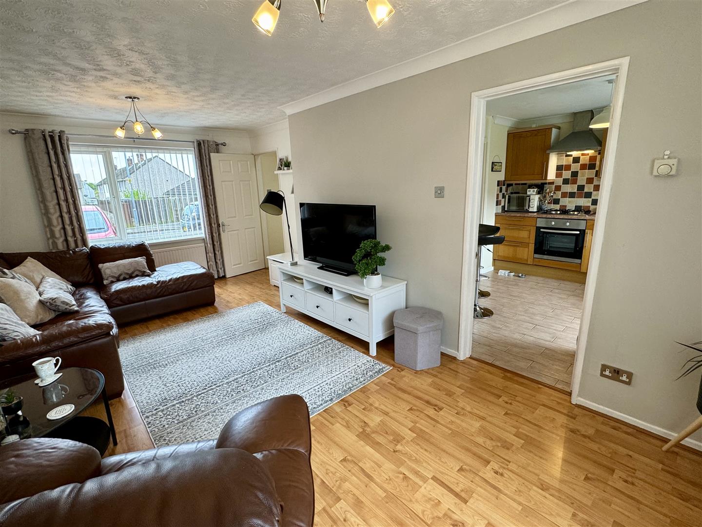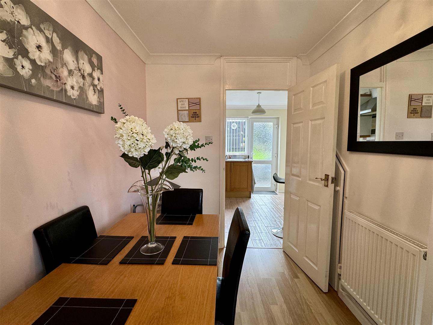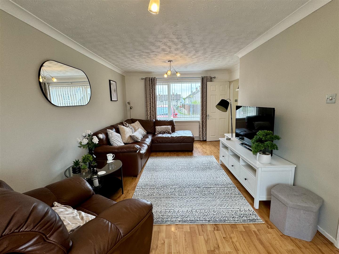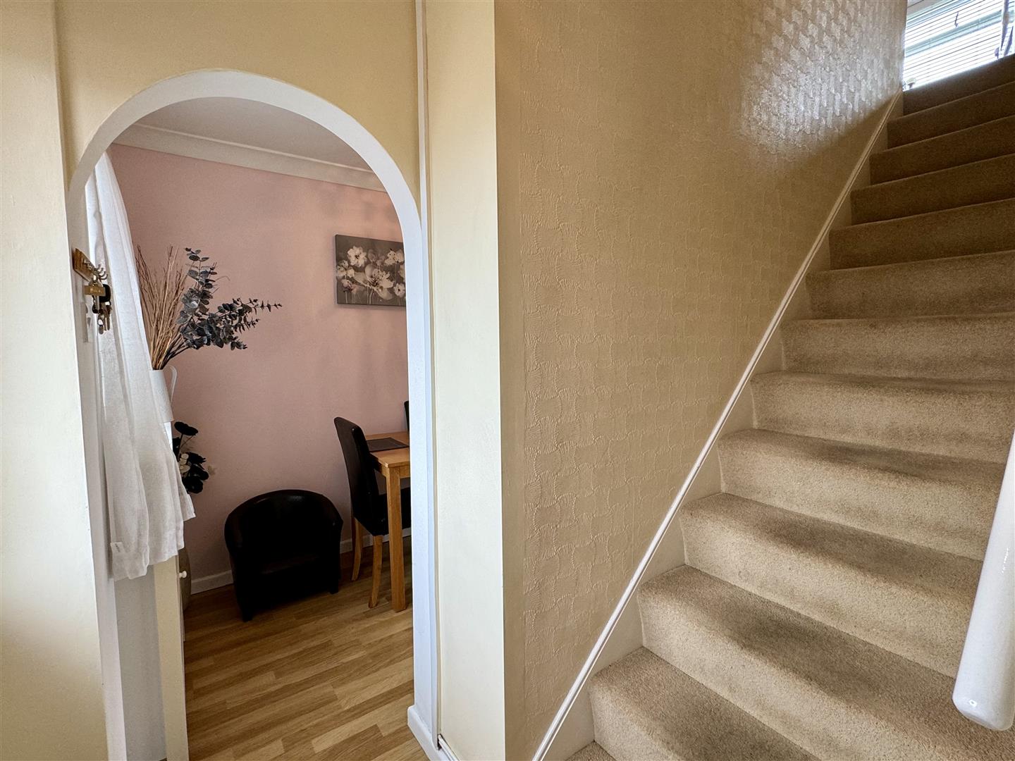 Coving. Wood effect flooring. Understairs storage cupboard. Panelled radiator. UPVC double glazed window to front elevation. Door to kitchen/breakfast room.
