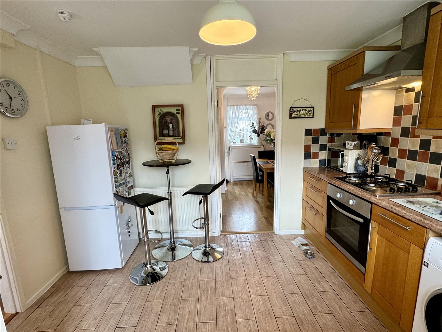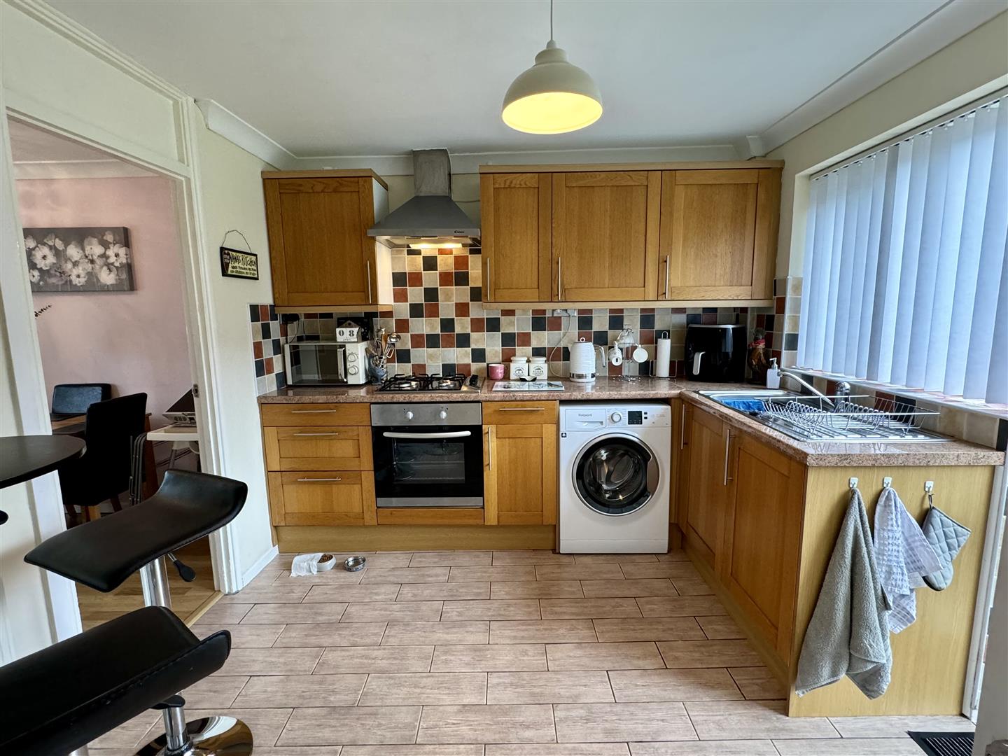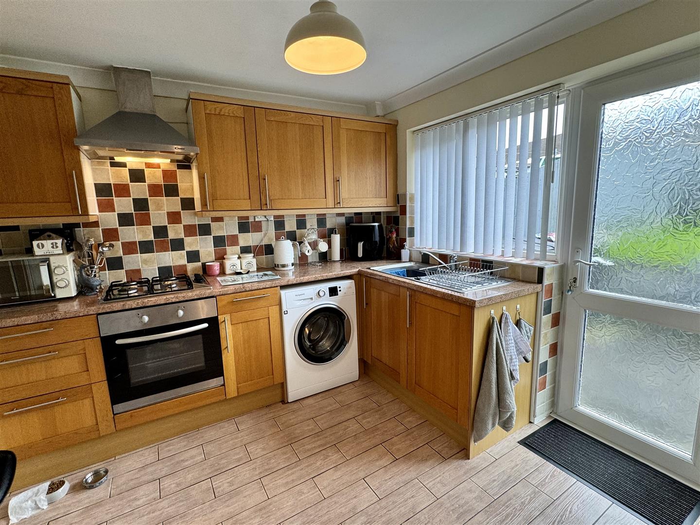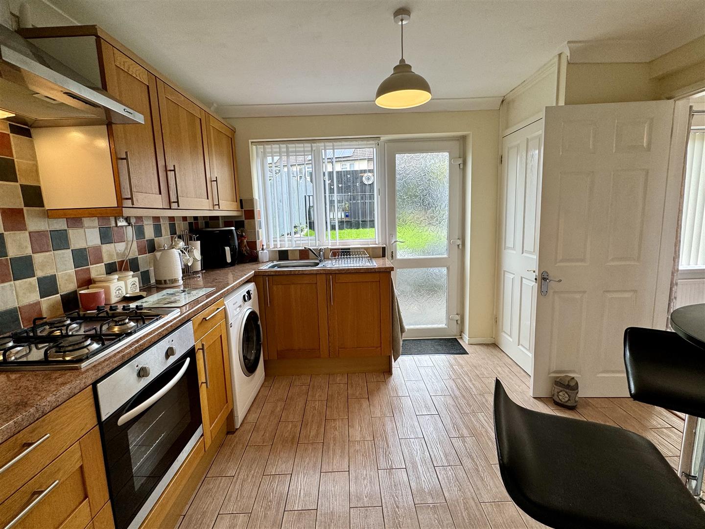 Coving. Range of wooden fronted base and eye level storage units all with granite effect work surfaces and tile splash backs. Single drainer stainless steel sink and mixer tap set into work surface. Built in fan assisted electric oven. Four ring gas hob set into work surface with tile splash back and stainless steel extractor hood and lighting over. Space for upright fridge freezer. Tiled floor. Cupboard housing wall mounted gas fired combination boiler. Panelled radiator. UPVC double glazed door and window to rear elevation. Door to living room.