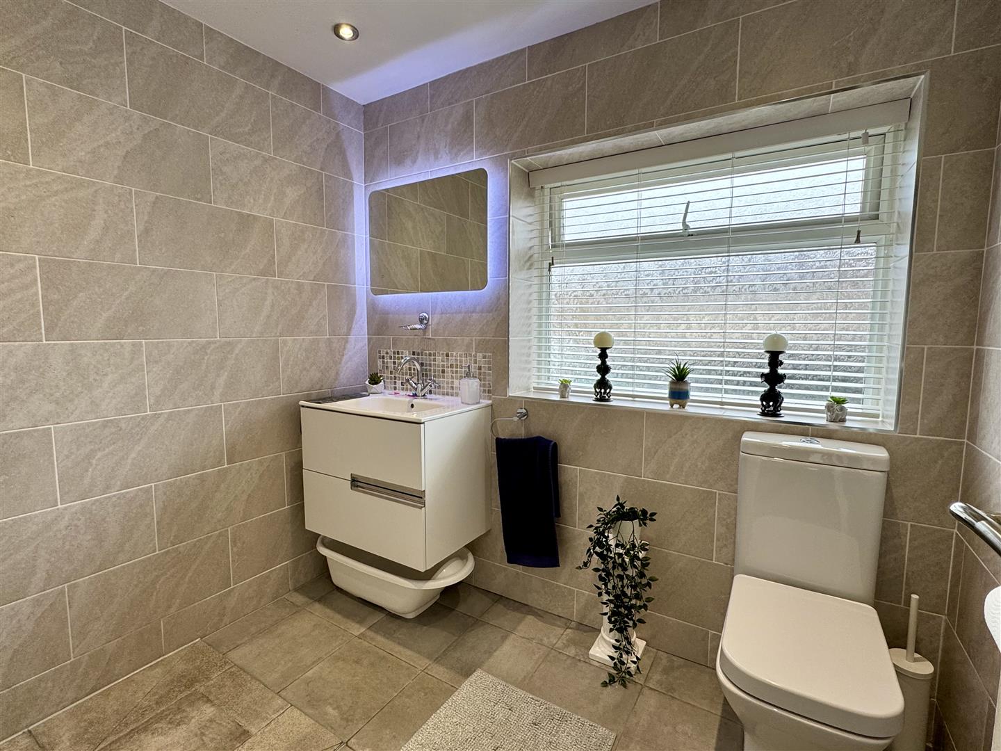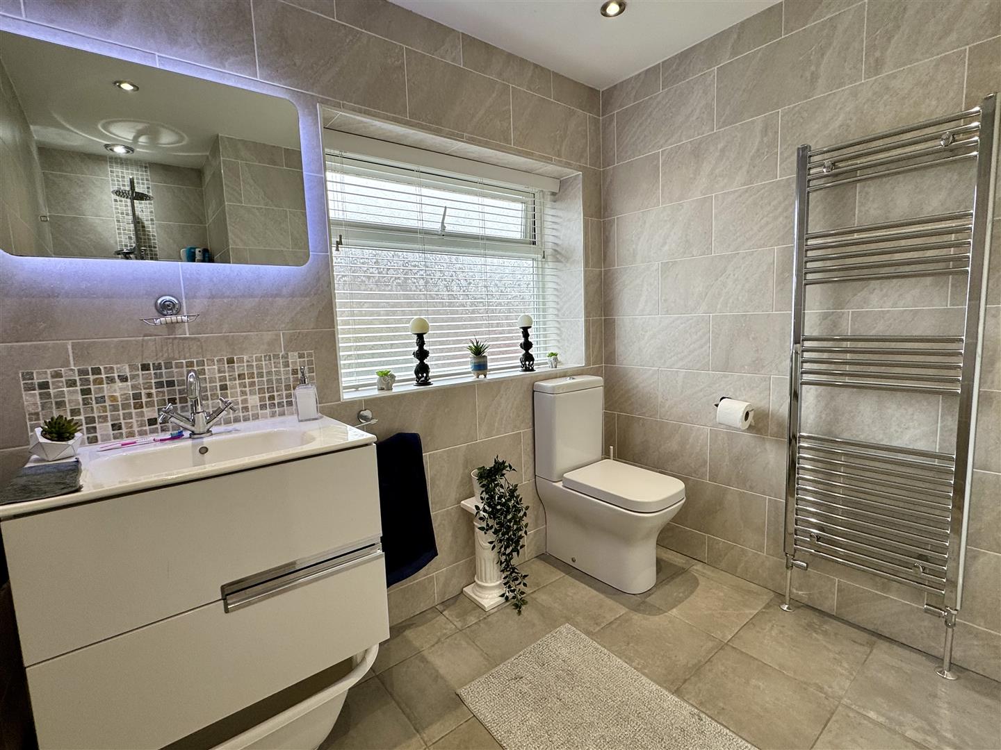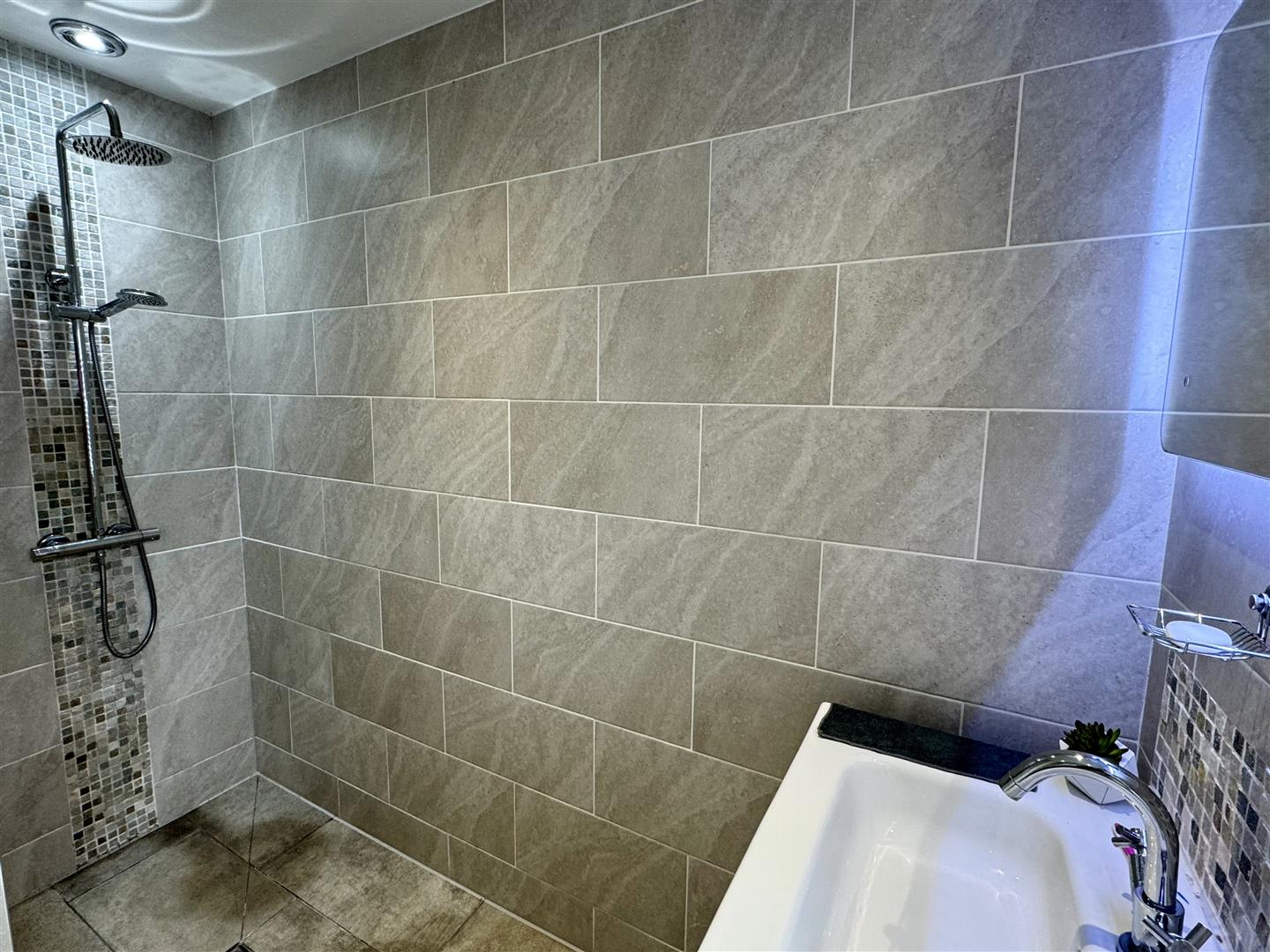 Inset spotlighting and extractor to plain ceiling. Modern white suite comprising, low level W.C. with dual push button flush and wash hand basin with chrome mixer tap set over vanity storage. Mirror and light over. Walk in shower with rainwater shower and separate shower attachment over. Full tiling to walls. Tiled floor. Chrome towel radiator. Opaque uPVC double glazed window to rear elevation.