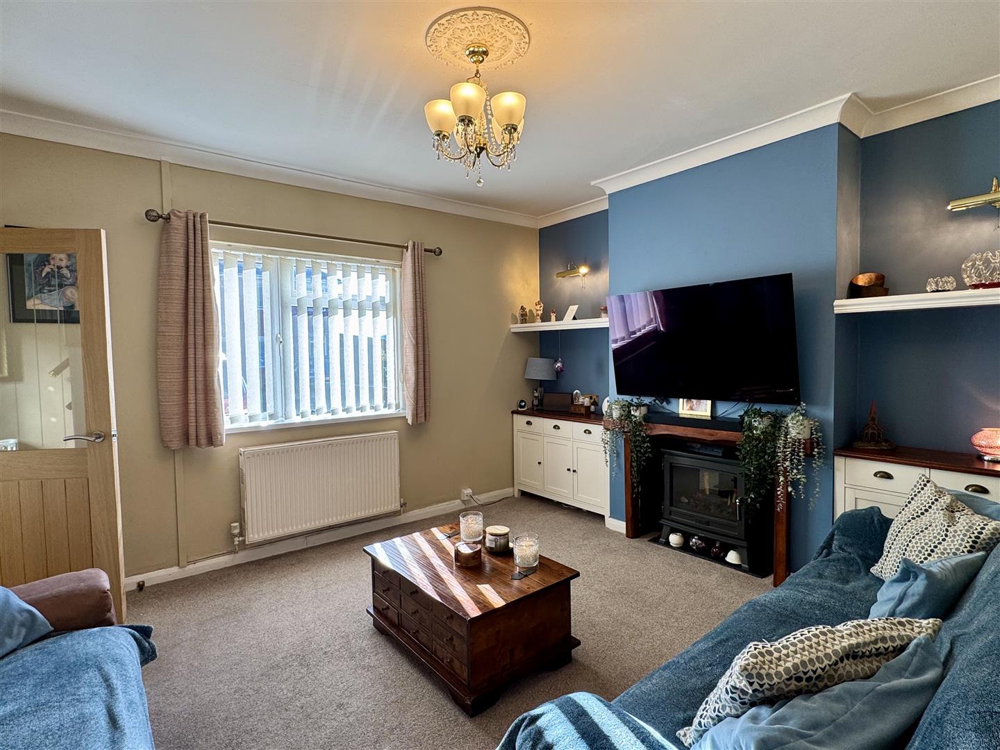 Coving. Feature fireplace. Under stairs storage cupboard. UPVC double glazed window to front elevation. Door to dining room.