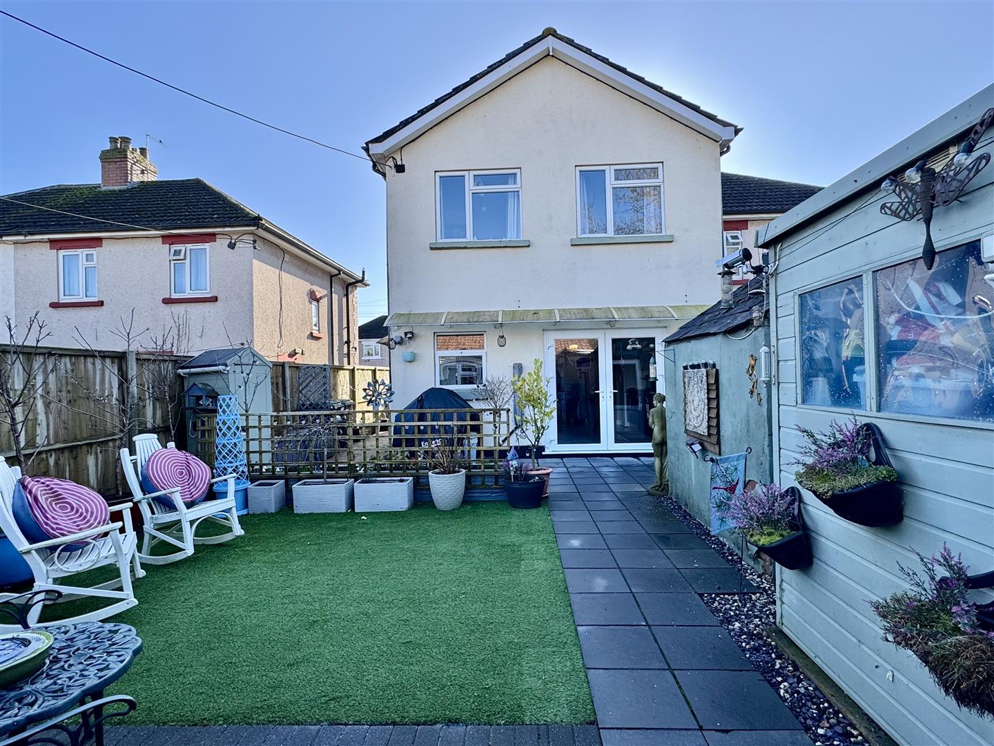 Accessed via kitchen patio doors or via side access is the rear garden which is of courtyard design. Adjacent to house is a full width paved seating area, leading to faux grass area for ease of maintenance and a further paved seating/outdoor dining area
