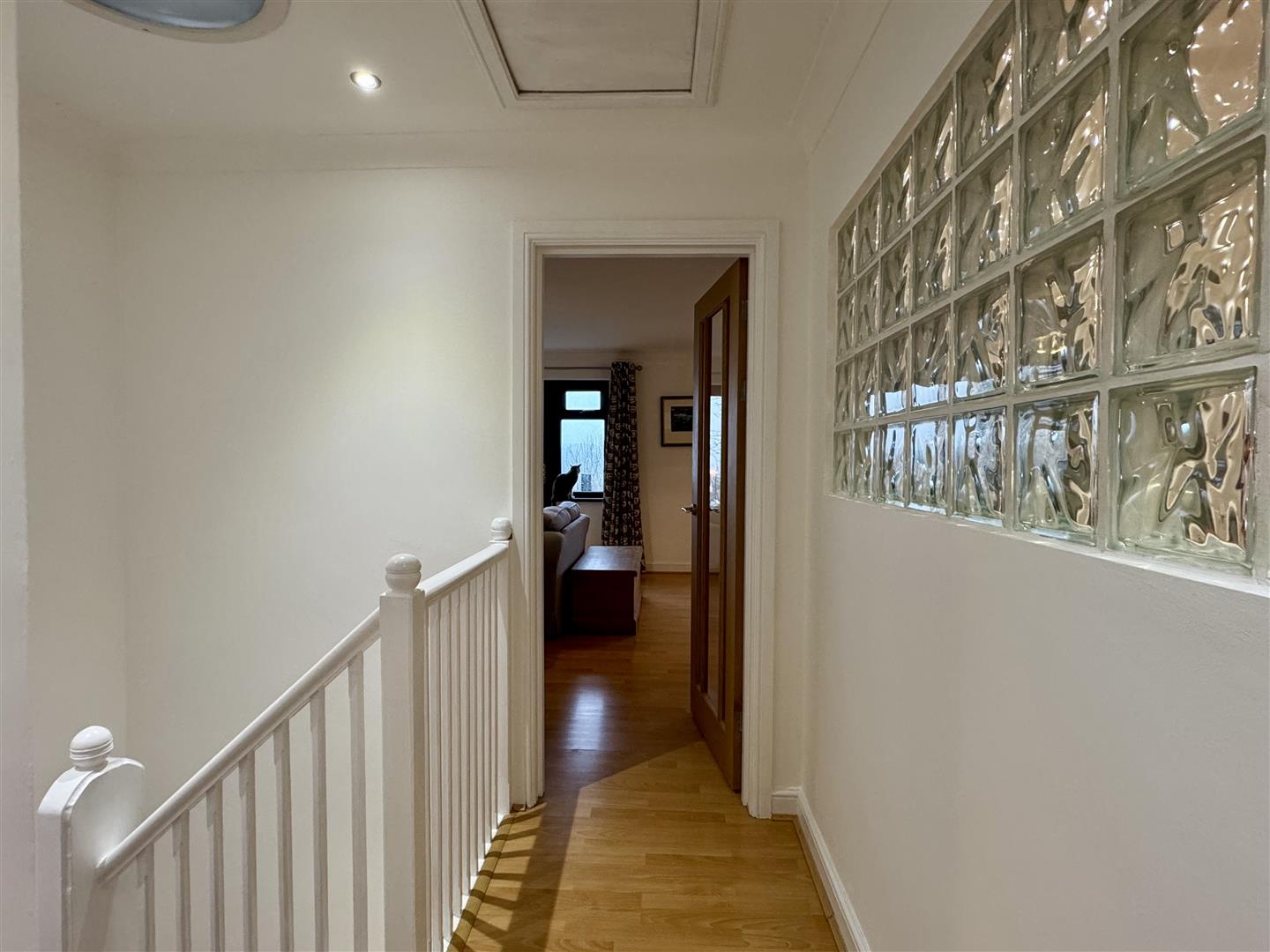 Approached via a composite panelled door with double glazed insert, Coving.Inset spotlighting. Access to loft inspection point. Sun tube which brings natural light into the stairwell. Good quality wood effect flooring. Glass block feature wall. Panelled radiator. Turn stairs to lower ground floor. Doors off.
