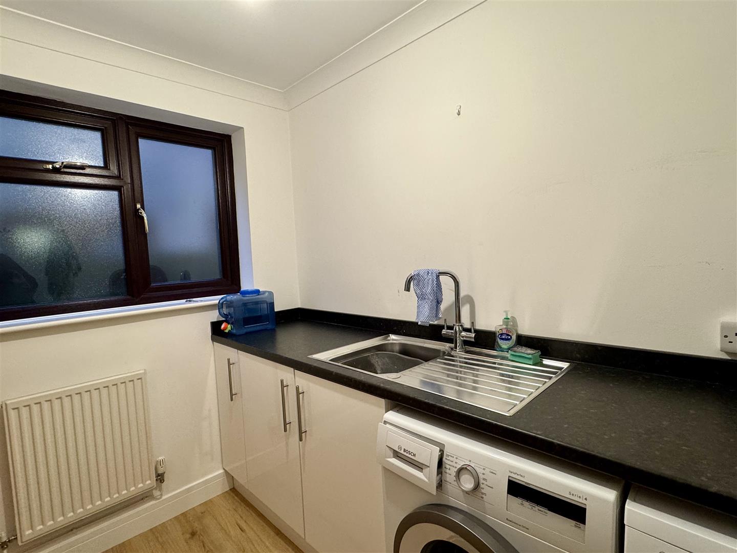 Coving. Base storage units with granite effect work surfaces and complimentary up stands. Single drainer stainless steel sink and mixer tap set into work surface. Plumbing and space for automatic washing machine. Good quality wood effect flooring. Panelled radiator. Opaque UPVC double glazed window to side elevation.