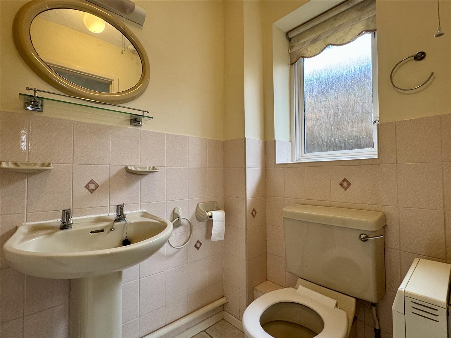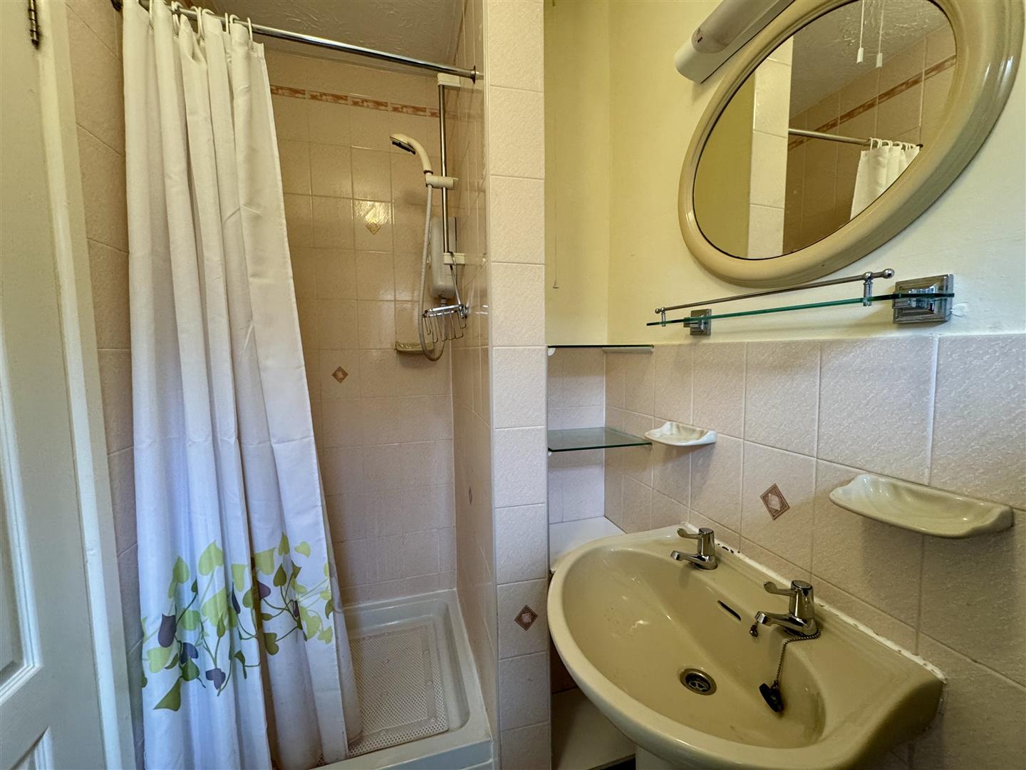 Low level W.C. Pedestal wash hand basin. with light and shaver point over. Step in enclosure with electric shower. part tiling to walls. electric heater. Opaque double glazed window to rear elevation.