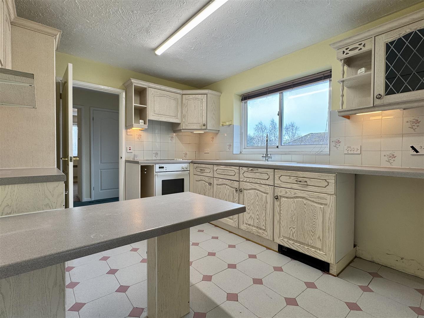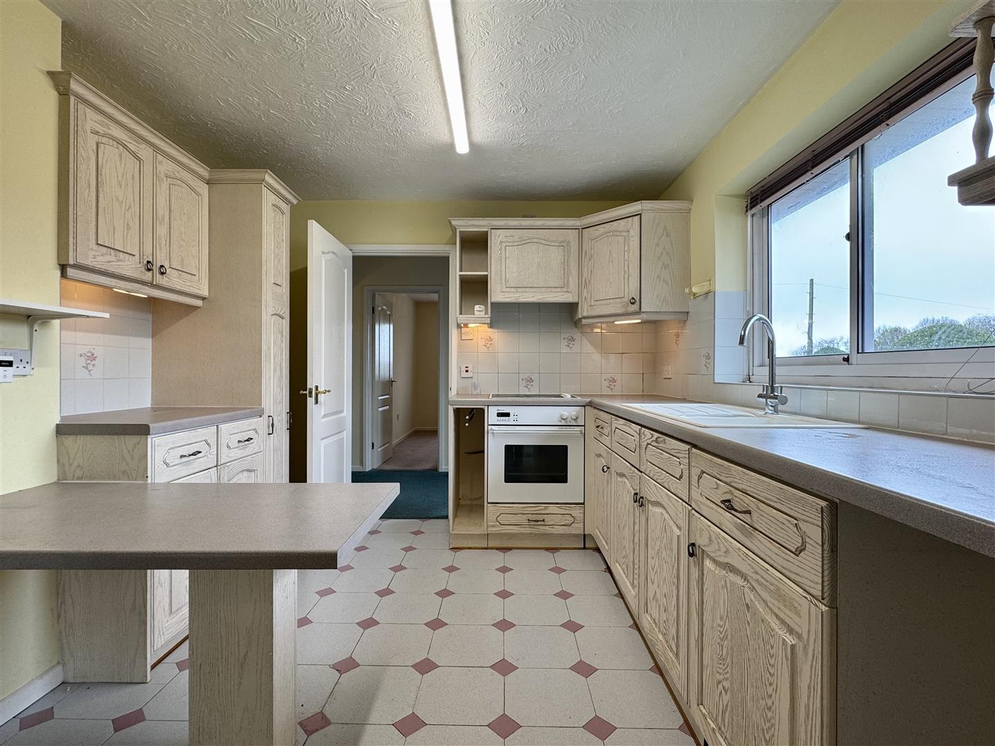 Fitted with a matching range of base and eye level storage units with open display and glass fronted cabinets. Under pelmet lighting. Built in oven (not working) Four ring electric hob set into work surface (not working) plumbing and space for automatic washing machine. Space for upright fridge freezer. Breakfast bar. Tiled floor throughout. Double glazed window. Door to utility area. Door to living room.