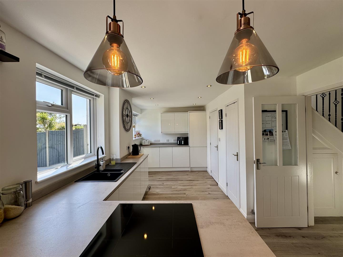 Upon entering the property, you are greeted by a welcoming entrance hall which leads to a stunning contemporary open-plan kitchen, complete with integrated appliances and French doors opening out to the attractively landscaped rear garden, perfect for entertaining or relaxing. Off the dining area a bright and spacious living room approached via glazed doors. An inner hallway off the kitchen provides access to a ground floor W.C. and garage.