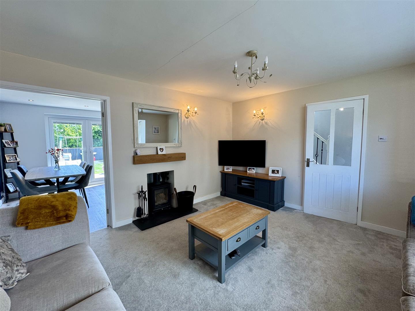 Wrought iron wood burner. Panelled radiator. UPVC double glazed bay window to front elevation. Glazed doors to open plan kitchen dining room.