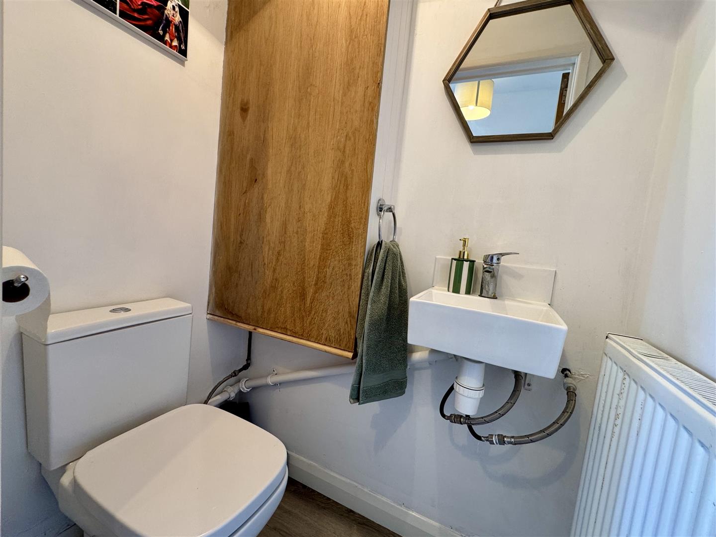 Low level W.C. Wash hand basin with chrome mixer tap and tile splash back. Extractor fan. Good quality wood effect flooring. Panelled radiator. Cupboard housing wall mounted mains gas fired combination boiler.
