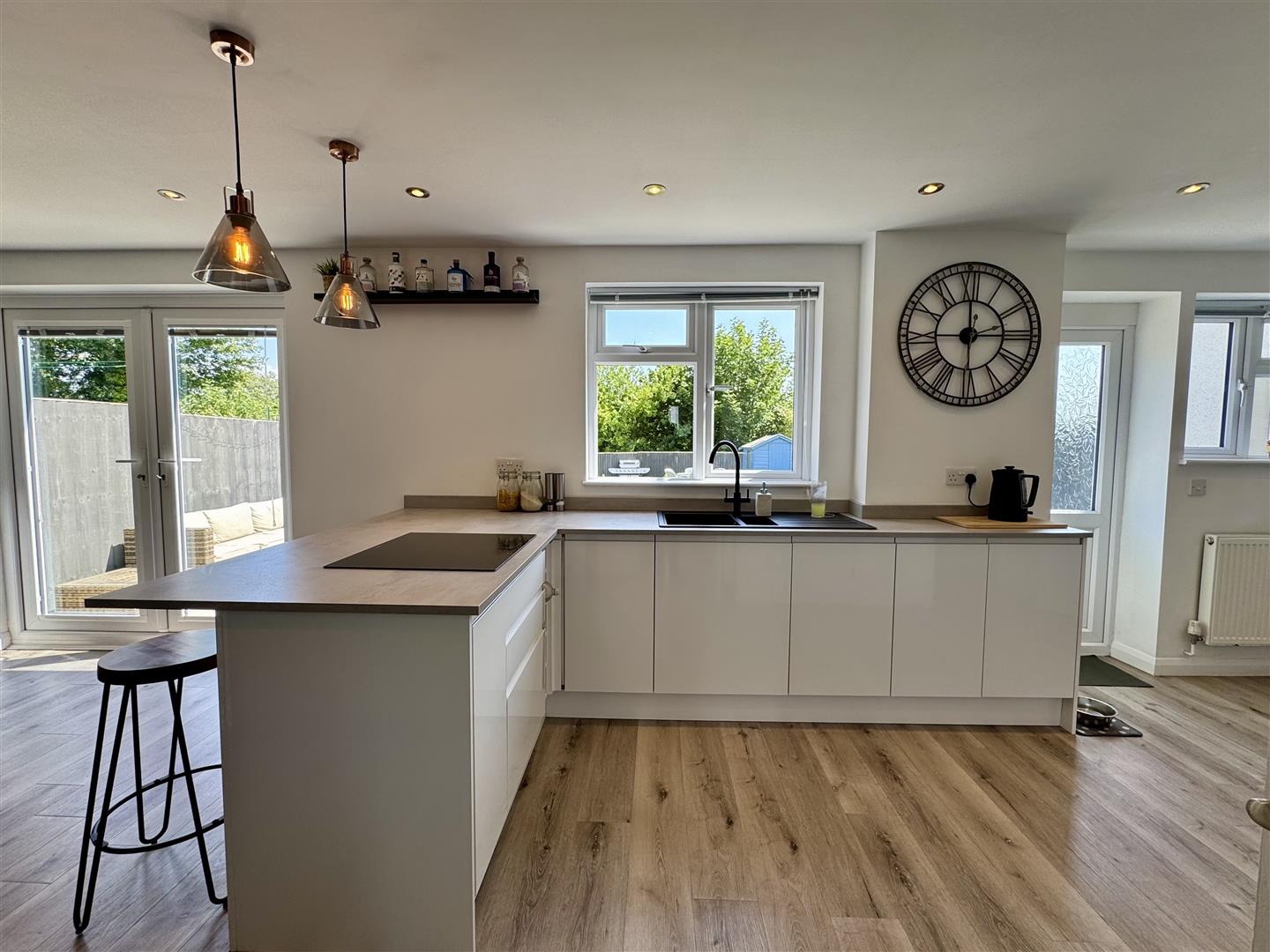 Inset spotlighting. Installed in 2023 with a superb range of two tone contemporary base and eye level storage units all with quartz work surface and complimentary upstands. One and half bowl sink and mixer tap set into work surface. Breakfast for 3-4 people. Built in twin electric ovens. Four ring touch control induction hob. built in fridge freezer, dish washer and washing machine. Power point and TV aerial point for wall mounted TV. Good quality wood effect flooring throughout. Two panelled radiators. UPVC double glazed glazed french doors from the dining are to rear garden. Two UPVC double glazed windows to rear garden. UPVC double glazed an d panelled door to rear garden from the kitchen area. Door to inner hallway.