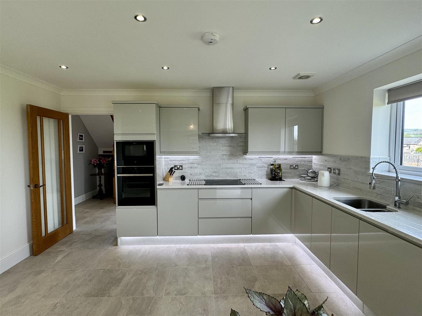 Coved and plain ceiling with inset spotlighting. Access to loft inspection point. UPVC double glazed window to side elevation.