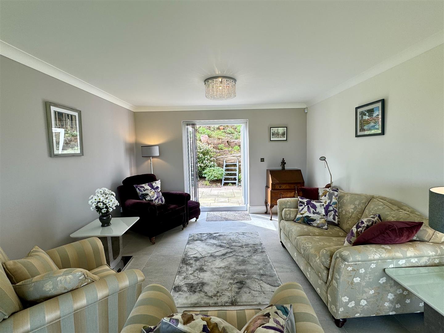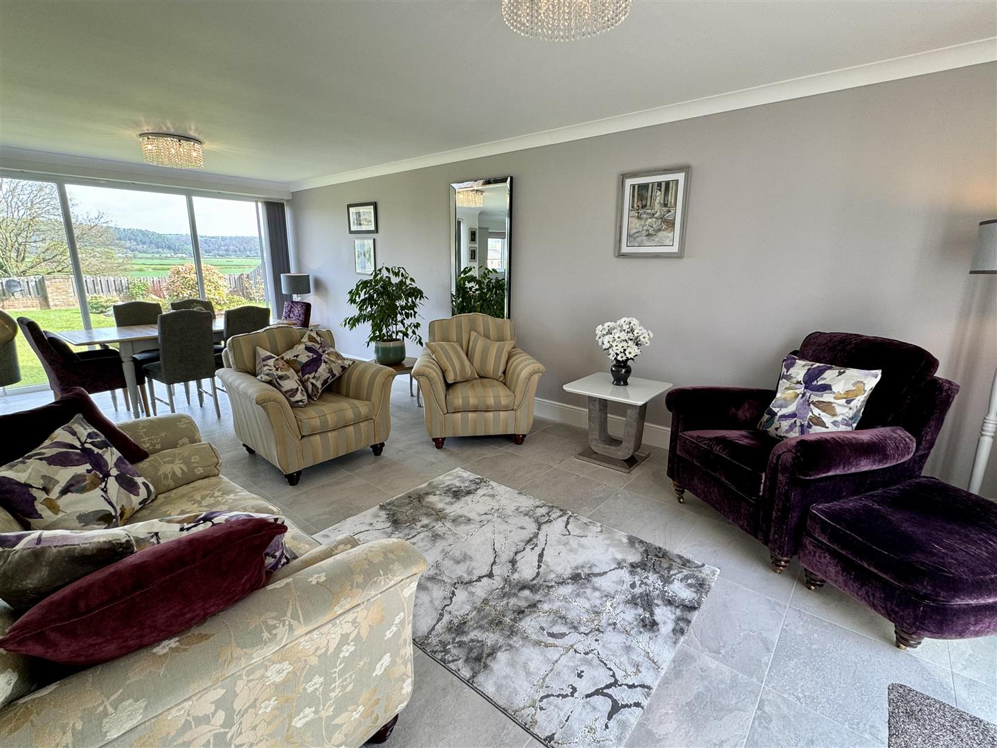 Coved and plain ceiling. Continuation of tile floor with underfloor heating. UPVC double glazed french doors to rear garden.