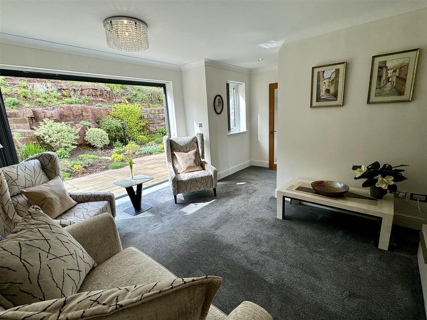 Outside, the property is approached by remote-controlled double wrought iron gates leading to the garage and driveway. The beautifully landscaped gardens feature an exposed sandstone outcrop seamlessly integrated into the garden design, along with a woodland area belonging to the property.