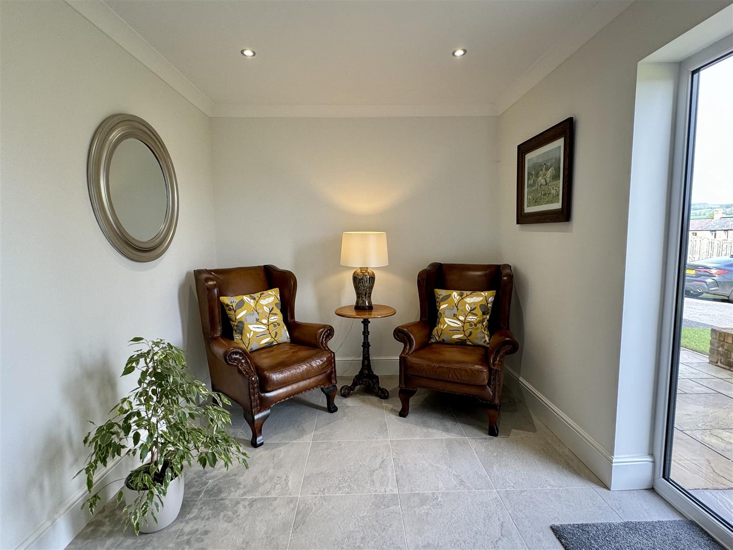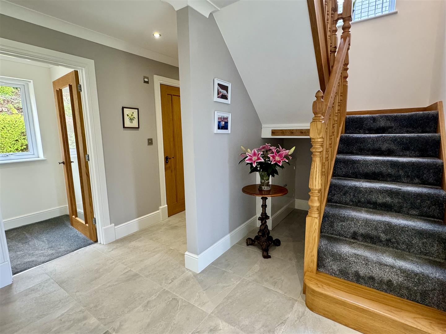 Approached via composite panelled door with double glazed inserts and complimentary side windows. Coved and plain ceiling with inset spotlighting. Tile floor with individual controlled underfloor heating. Home alarm control panel. Solid wooden stairs to first floor landing. Doors off.