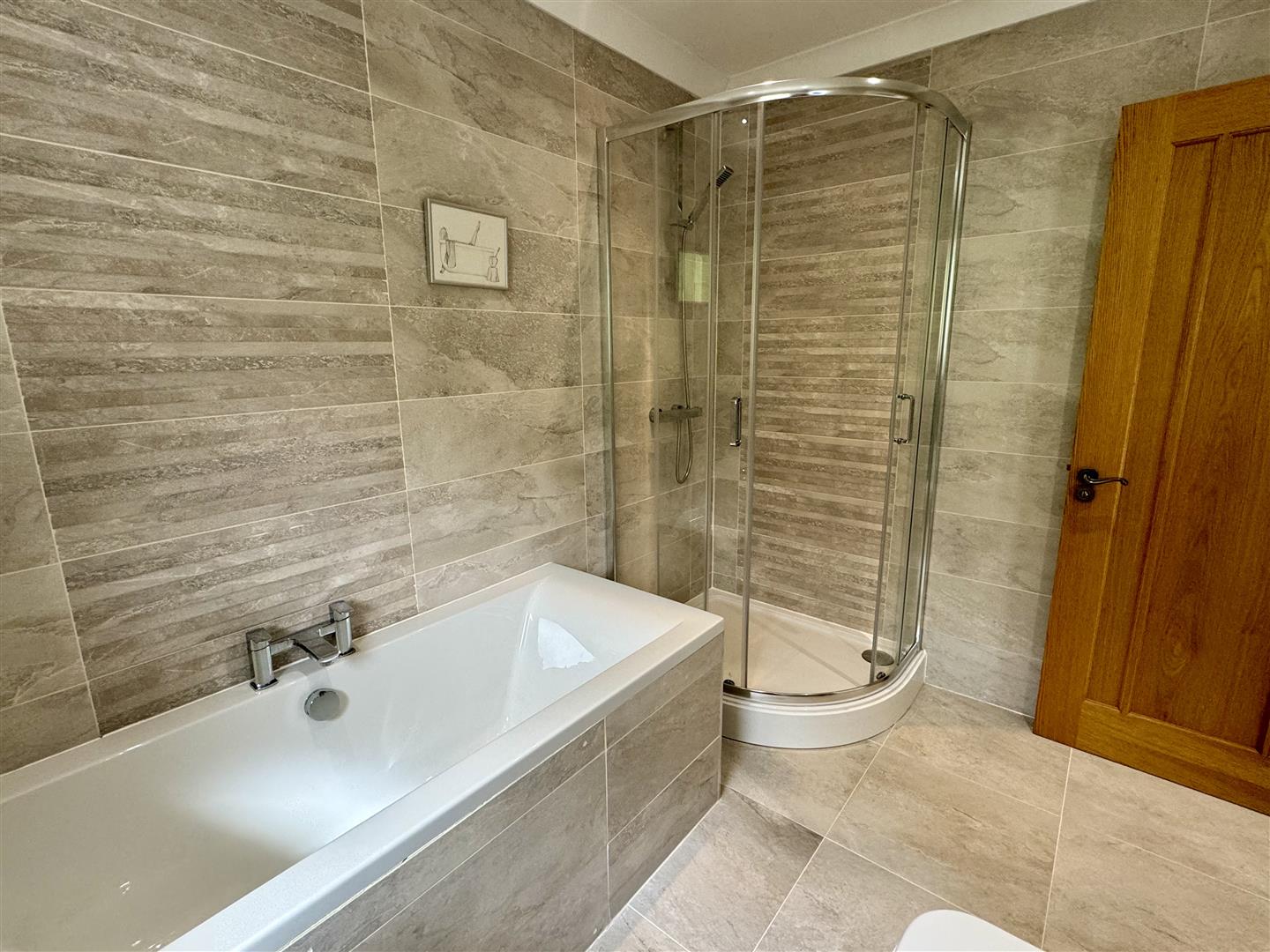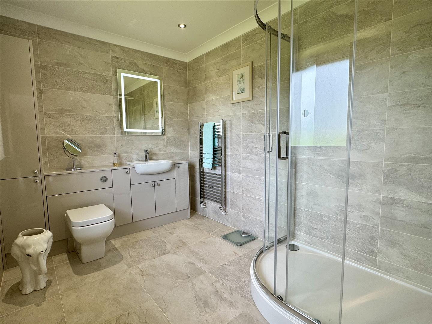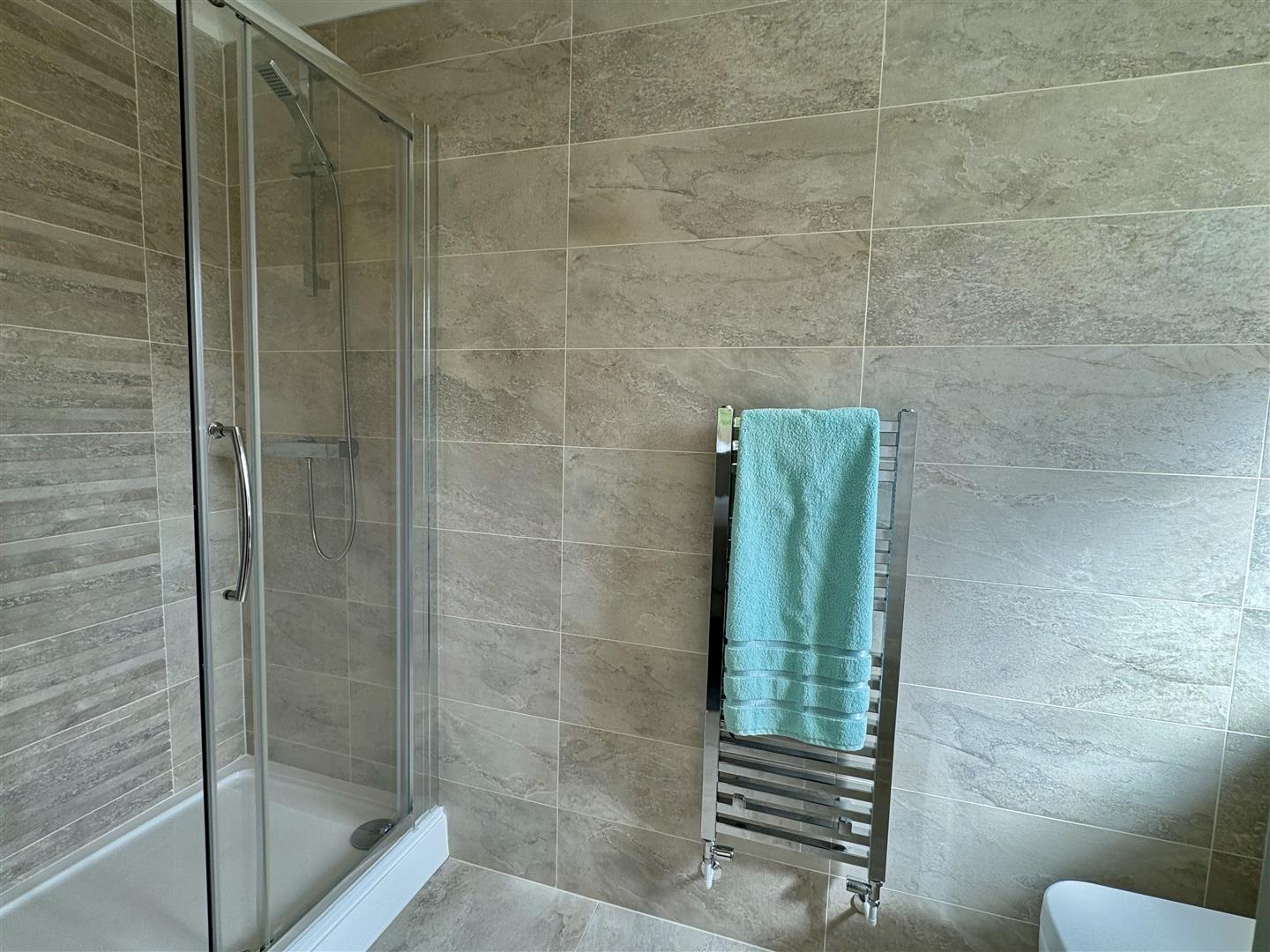 Coved and plain ceiling with inset spotlighting and extractor fan. Wash hand basin and chrome mixer tap set over vanity storage unit. Low level W.C. with dual pushbutton flush. Step in enclosure with mains fed shower. Fully tiled walls and floor. Chrome towel radiator. Opaque uPVC double glazed window to side elevation.