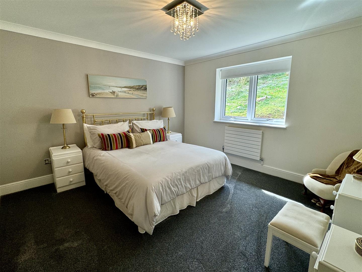 Coved and plain ceiling. Panelled radiator. Full height uPVC double glazed picture window to front elevation with views. Door to en-suite shower room.