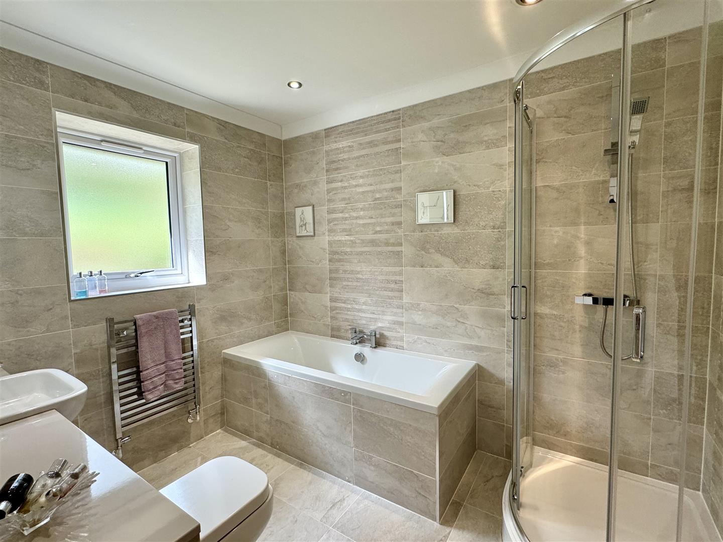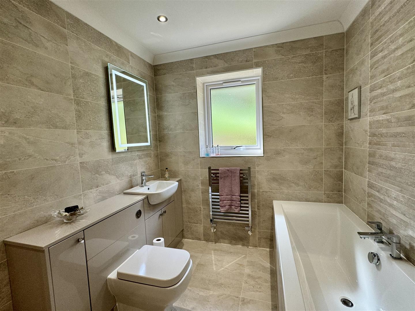 Coved and plain ceiling with inset spotlighting and extractor fan. Fitted with a modern white suite and range of storage units. Wash hand basin and chrome mixer tap set over vanity storage. Low level W.C. with dual push button flush. Double ended bath with chrome mixer tap. Corner enclosure with mains fed shower. Fully tiled walls and floor. Chrome towel radiator. Opaque uPVC double glazed window to rear elevation.