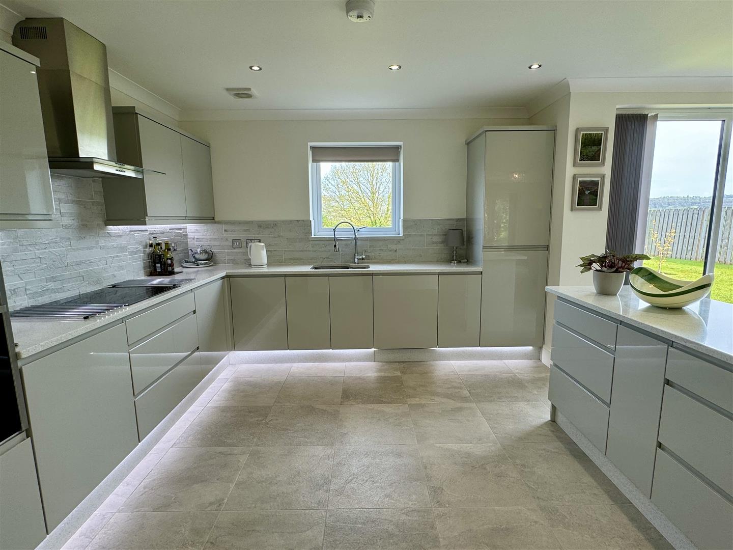 - STUNNING KICHEN AREA WITH INTEGRATED APPLIANCES QUARTZ WORK SURFACES AND BREAKFAST ISLAND AND SEPARATE UTILITY ROOM