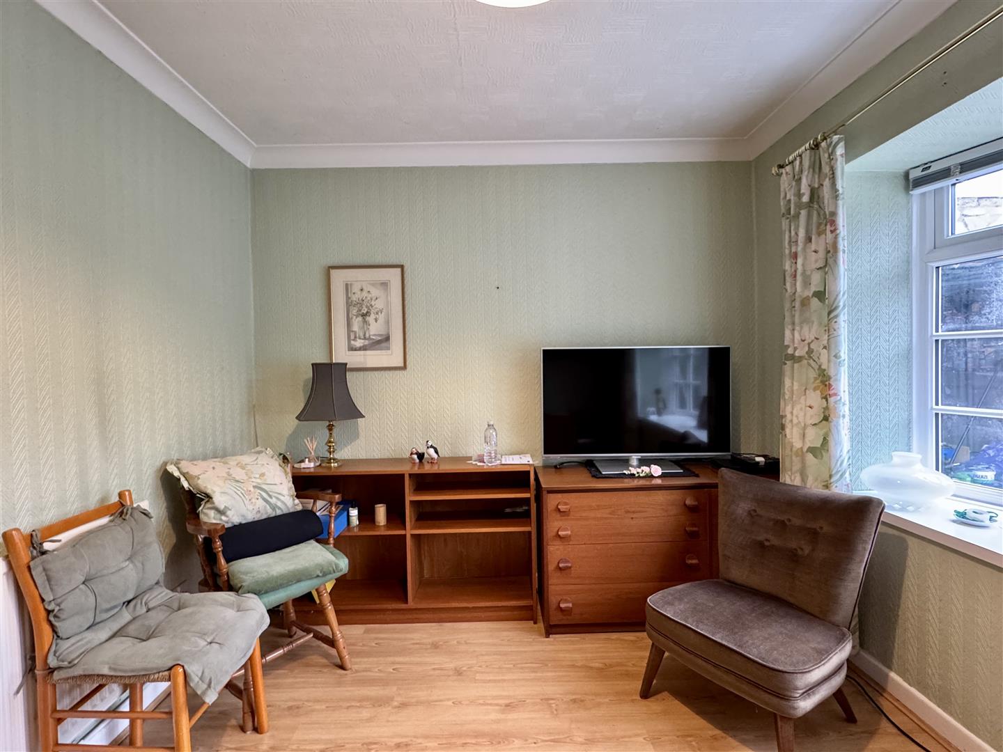 Coving. Wood effect flooring. Panelled radiator. Window to front elevation.