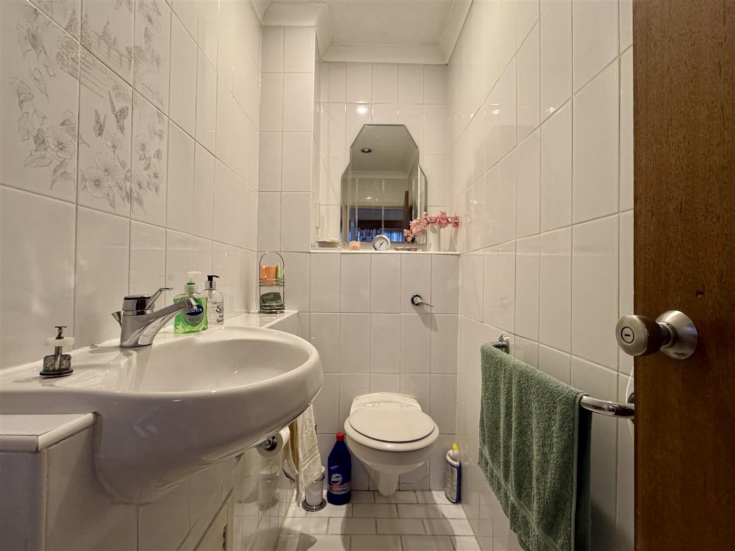 Coving. Light and extractor to ceiling. Low level W.C. with concealed cistern. wash hand basin and chrome mixer tap. Fully tiled walls. Tiled floor. Chrome towel radiator.