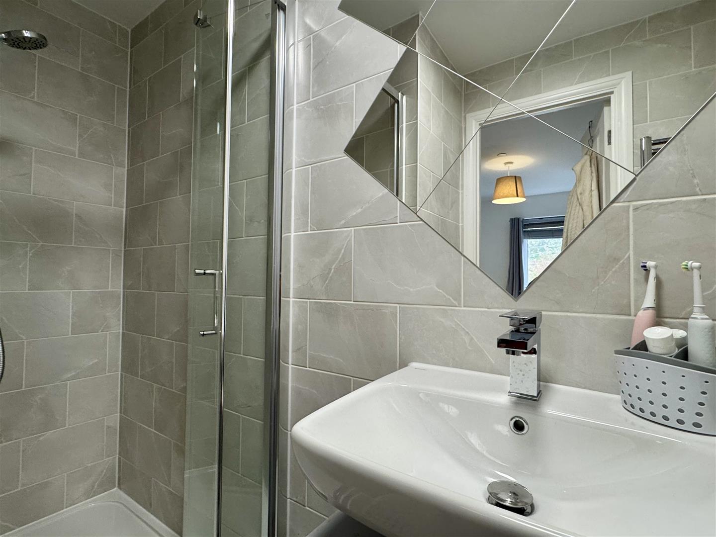 Low level W.C Pedestal wash hand basin with chrome mixer tap and tile splash back. Shaver point. Step in enclosure with mains fed shower. Full tiling to walls. Chrome towel radiator. Extractor fan. Opaque UPVC double glazed window to side elevation.