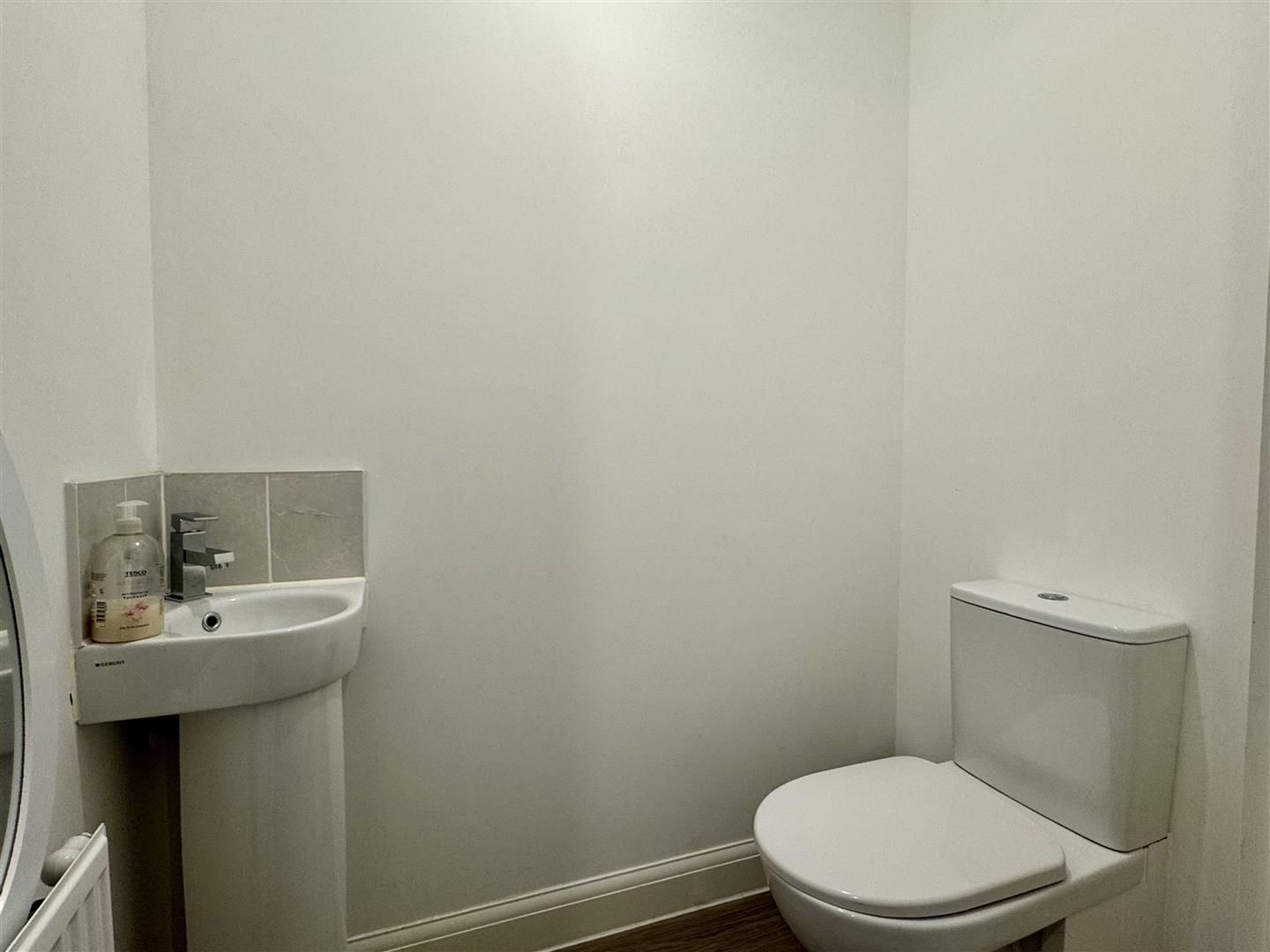 Corner pedestal wash hand basin with chrome mixer tap and tile splash back. Low level W.C. Extractor fan. Good quality wood effect flooring. Panelled radiator.