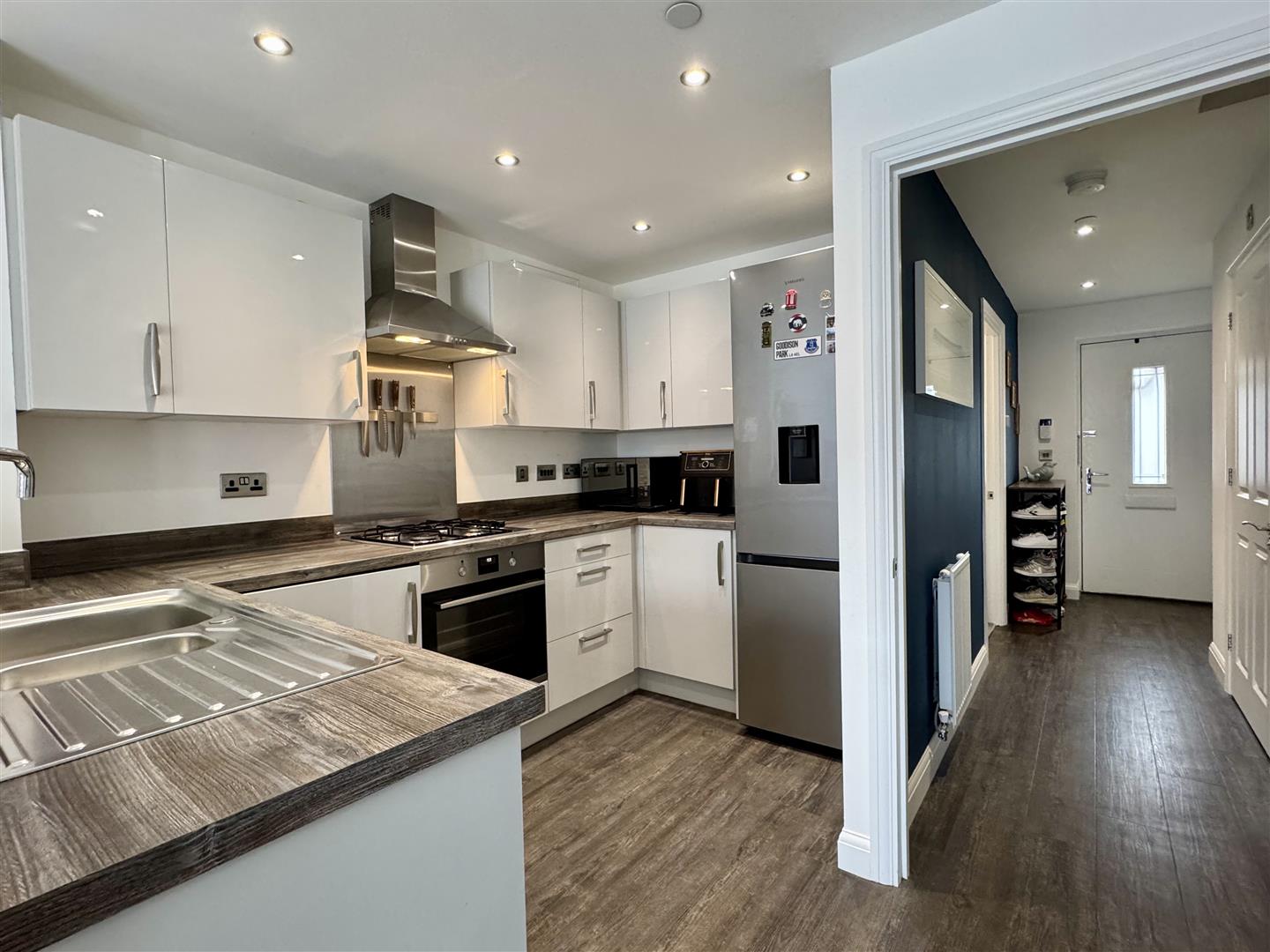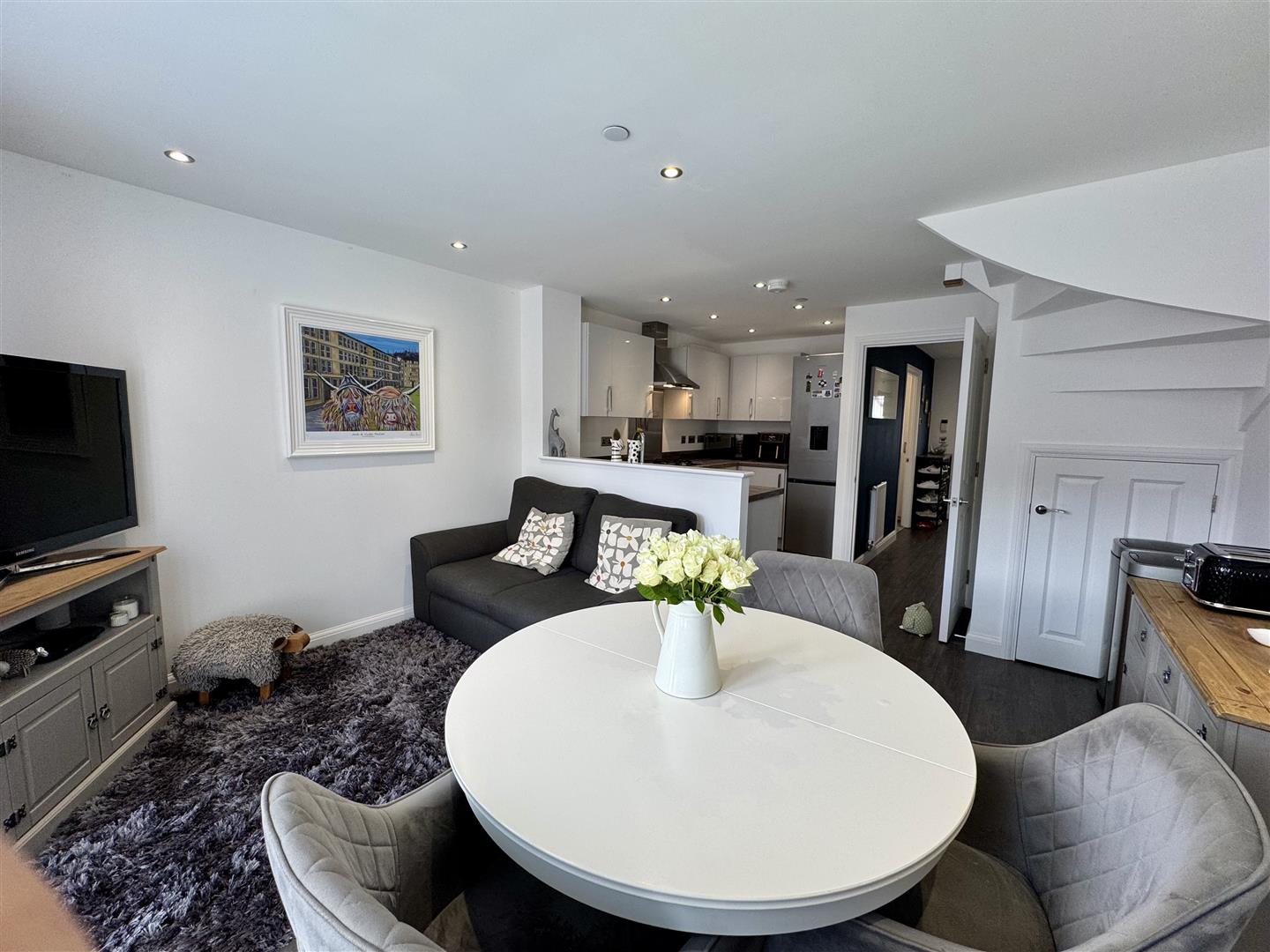 Inset spotlighting to plain ceiling. The kitchen area is fitted with a matching range of base and eye level storage units all with wood effect worksurfaces over and complimentary upstands. One and half bowl stainless steel sink with mixer tap, hot water tap and waste disposal unit. Built in fan assisted electric oven. Four ring gas hob, with stainless steel splash back and extractor hood with lighting over. Integrated dishwasher and washing drying machine. Space for fridge freezer. Open to the dining/living area. Amtico wood effect flooring throughout. Panelled radiator. UPVC double glazed french doors and windows with blinds to remain to landscaped rear garden.