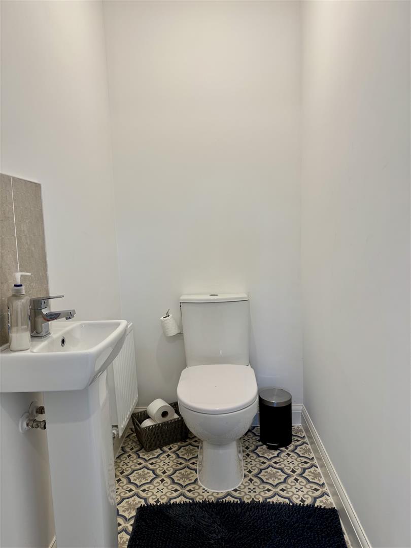 Low level W.C. with dual push button flush. Pedestal wash hand basin with chrome mixer tap and tile splash back.Tile effect flooring. Extractor fan. Panelled radiator.