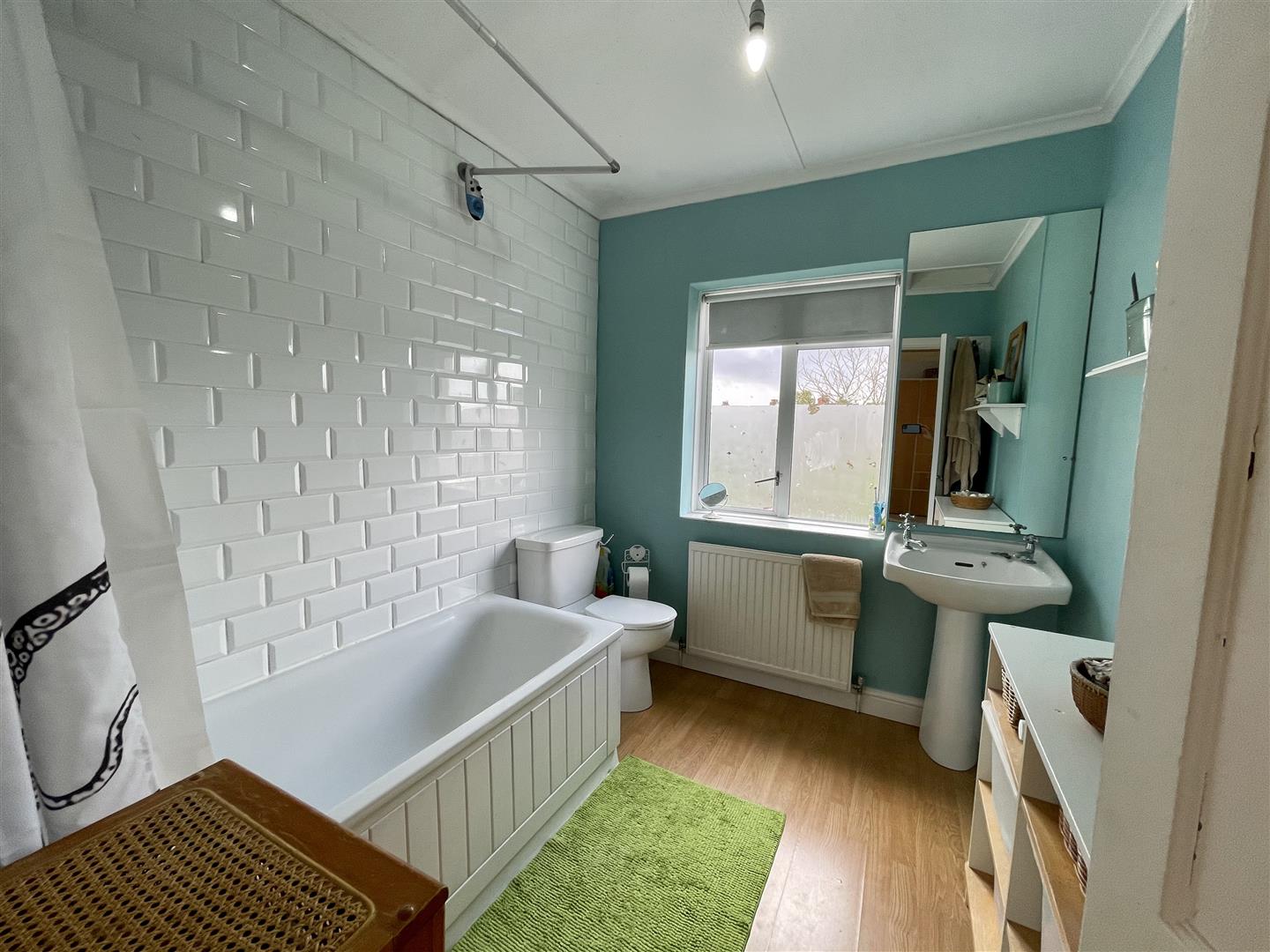 Low level W.C. with dual push button flush. Wash hand basin and chrome mixer tap. Plumbing and space for automatic washing machine and space for tumble dryer over. Wall mounted gas combination boiler. quarry tiled floor. panelled radiator. Opaque window to rear elevation.