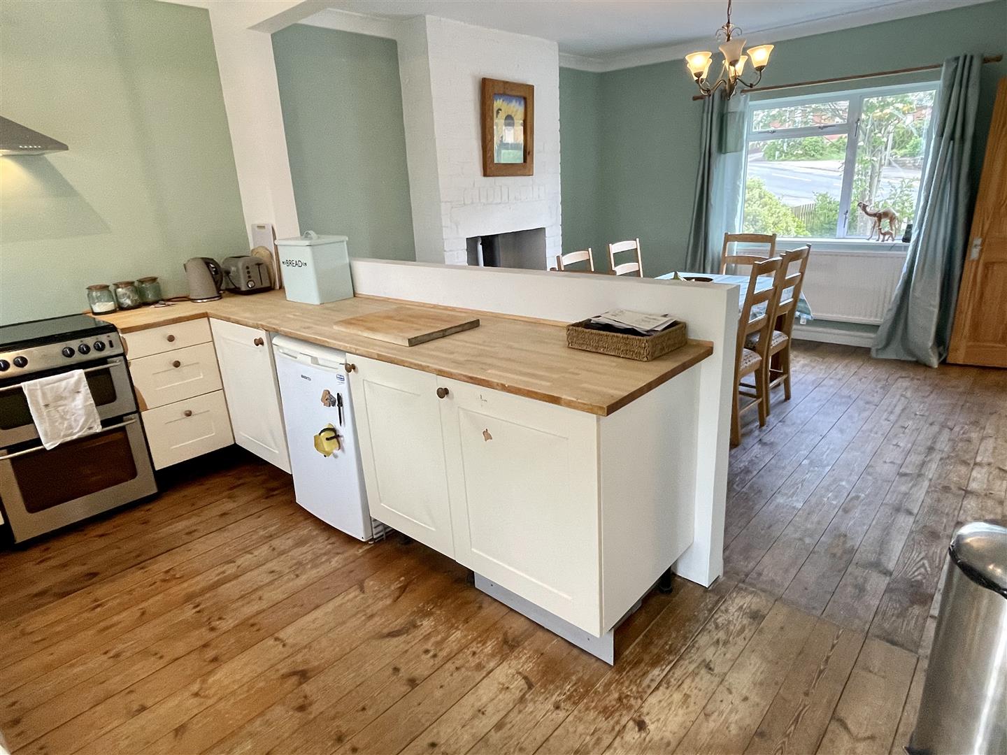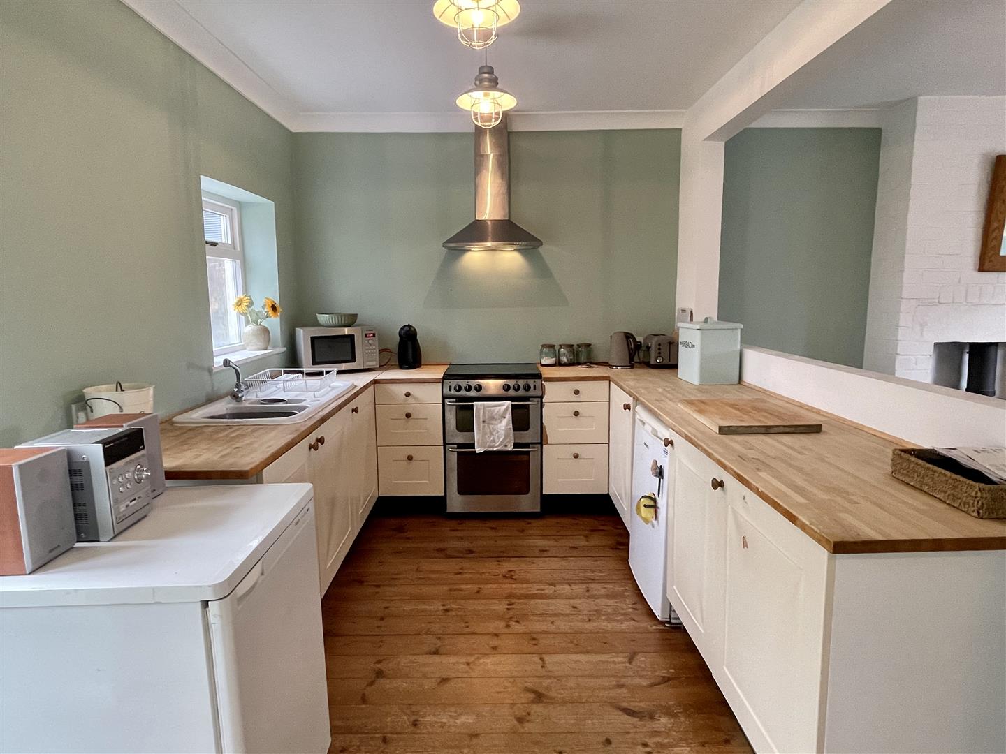 Fitted with a matching range of base units all of which have solid wooden work surfaces. Ceramic one and and half bowl sink and mixer tap set into worksurface. Space for cooker with stainless steel filter hood and lighting over. Space for under counter fridge. Exposed wooden floor boards. Wooden double glazed window to rear. UPVC double glazed french doors to rear garden.