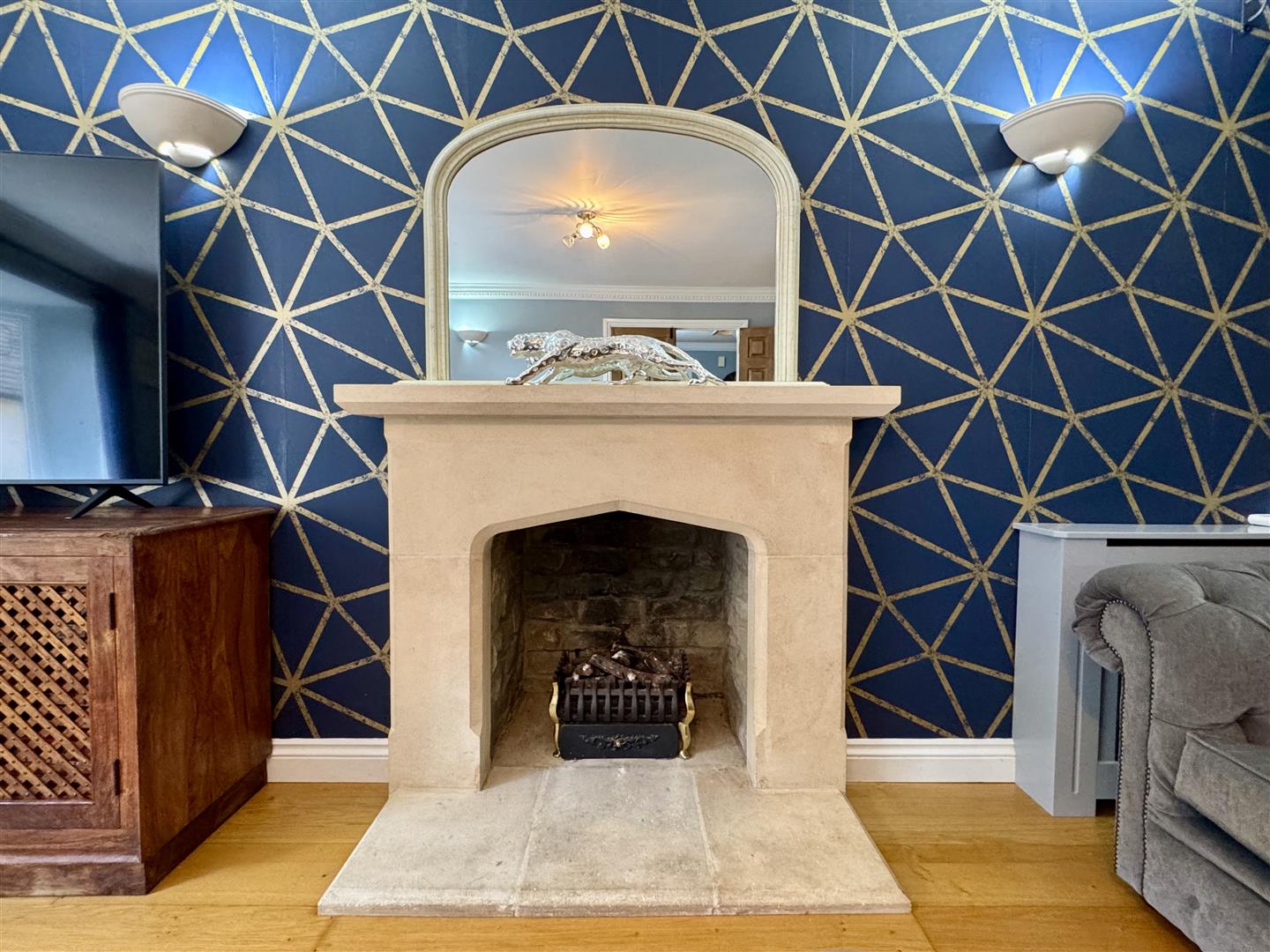 Ornate coving and plain ceilings. Open fireplace with sandstone surround and hearth. Two panelled radiators. Double doors to reception hall. UPVC double gazed bay window to front elevation. UPVC double glazed window to side.