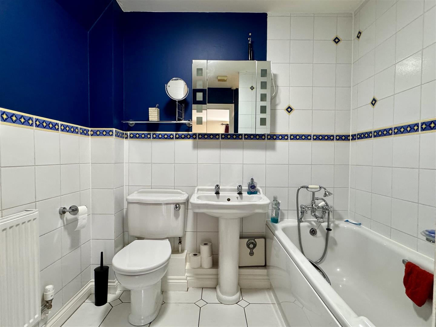 Low level W.C. Pedestal wash hand basin with tile splash back. Low level W.C. Chrome towel radiator. Tiled floor. Opaque UPVC double glazed window to side.