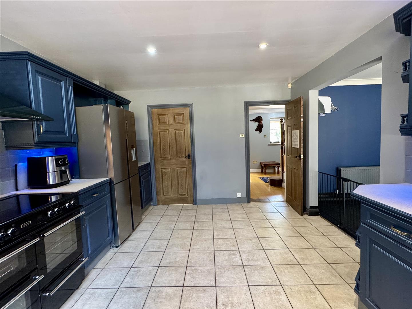 Inset spotlighting to plain ceiling. The kitchen is fitted with a matching range of base and eye level storage units all with work surfaces and tile splash backs, One and a half bowl sink and drainer set into work surface with mixer tap. Free standing range cooker to remain. Extractor fan and light over. Integrated dishwasher. Space for American style fridge freezer. Tiled floor throughout. UPVC double glazed window to rear elevation. Open to dining room. Door to utility room.