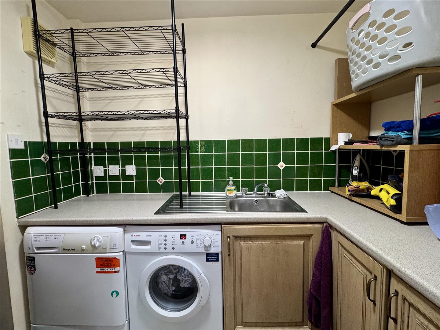 Base units with work surface and tile splash backs over. Single drainer stainless steel sink set into work surface. Plumbing and space for automatic washing machine and tumble dryer. Tiled floor. Panelled radiator. Glazed and panelled door to side elevation.