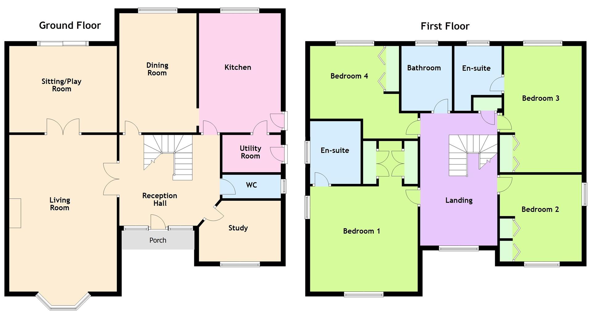 Upstairs, a spacious landing provides access to the primary bedroom, which benefits from a walk-in wardrobe and an en-suite bathroom with a separate shower. There is also a guest bedroom with an en-suite shower room, two further double bedrooms, and a stylish family bathroom.