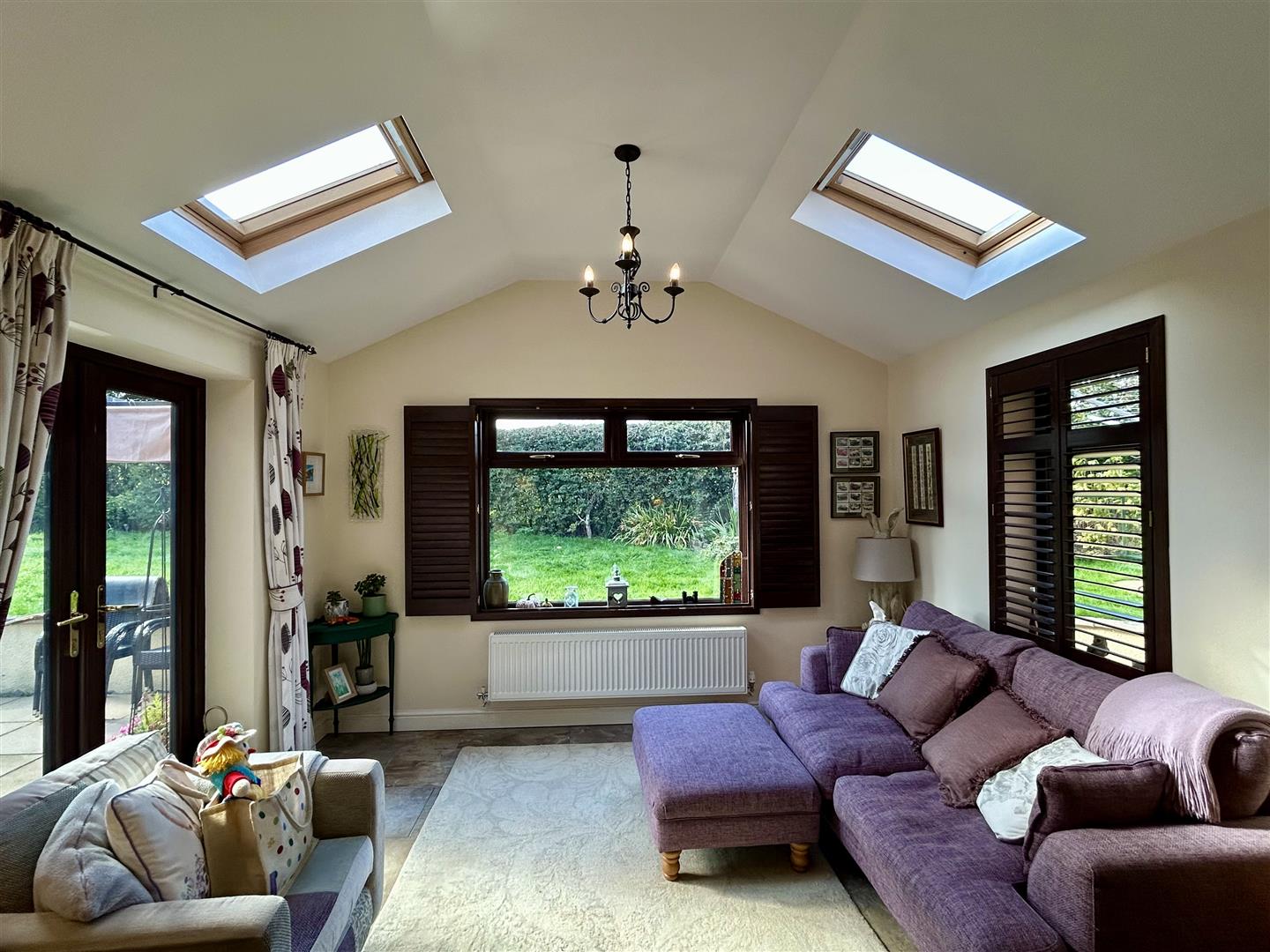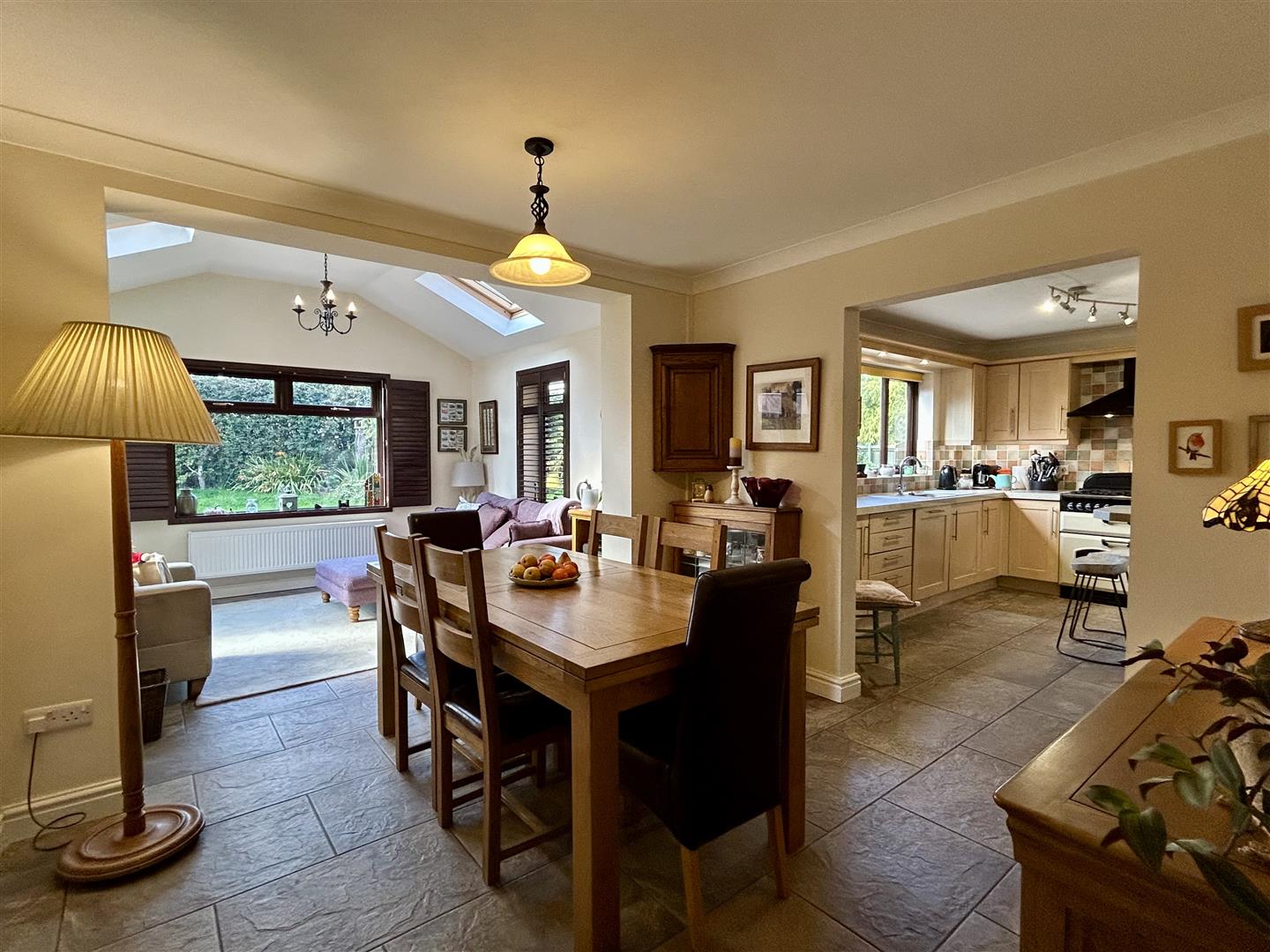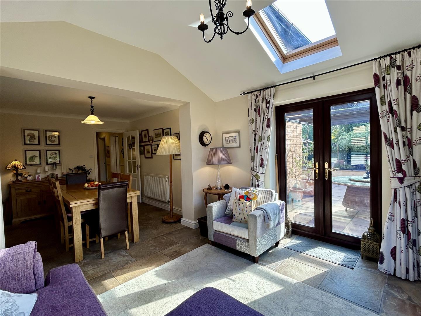 On the ground floor, you are welcomed by a spacious reception hall that leads into a large kitchen/breakfast room with adjoining utility room and an open-plan flow into the dining room. The dining area continues into a stunning sunroom extension featuring a vaulted ceiling and French doors opening onto the rear garden, perfect for entertaining or relaxing all year round.