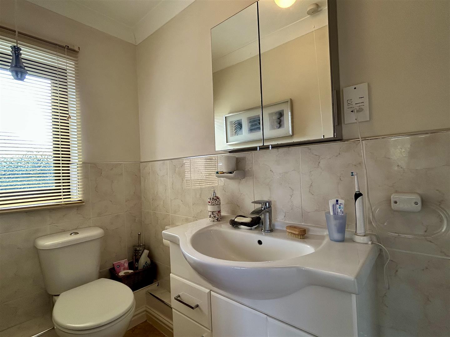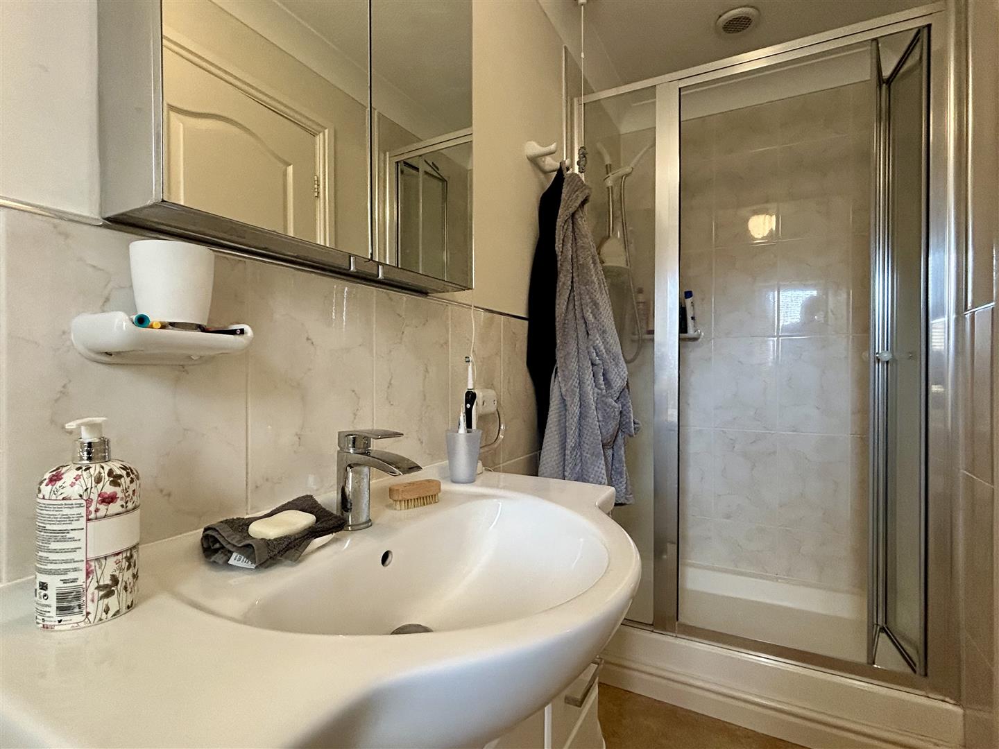 Coving. W.C. Wash hand basin with chrome mixer tap set over vanity storage unit. Mirrored cabinet over with shaver point. Step in enclosure with mains fed shower. Part tiling to walls. Panelled radiator. Opaque double glazed window to side elevation.