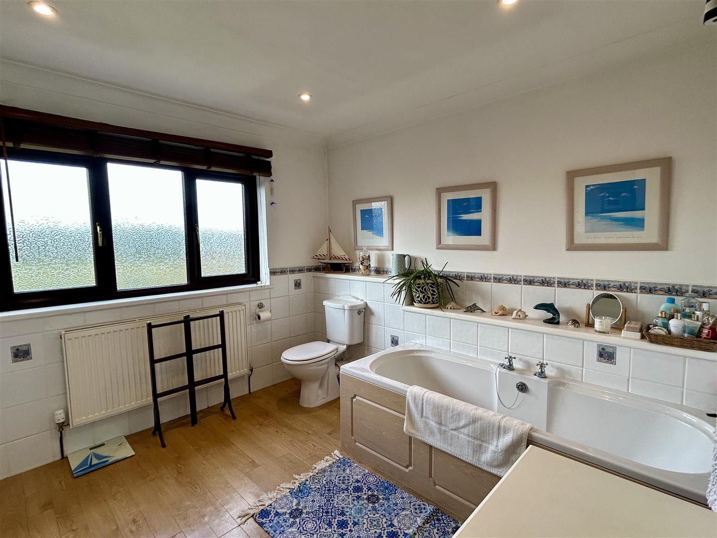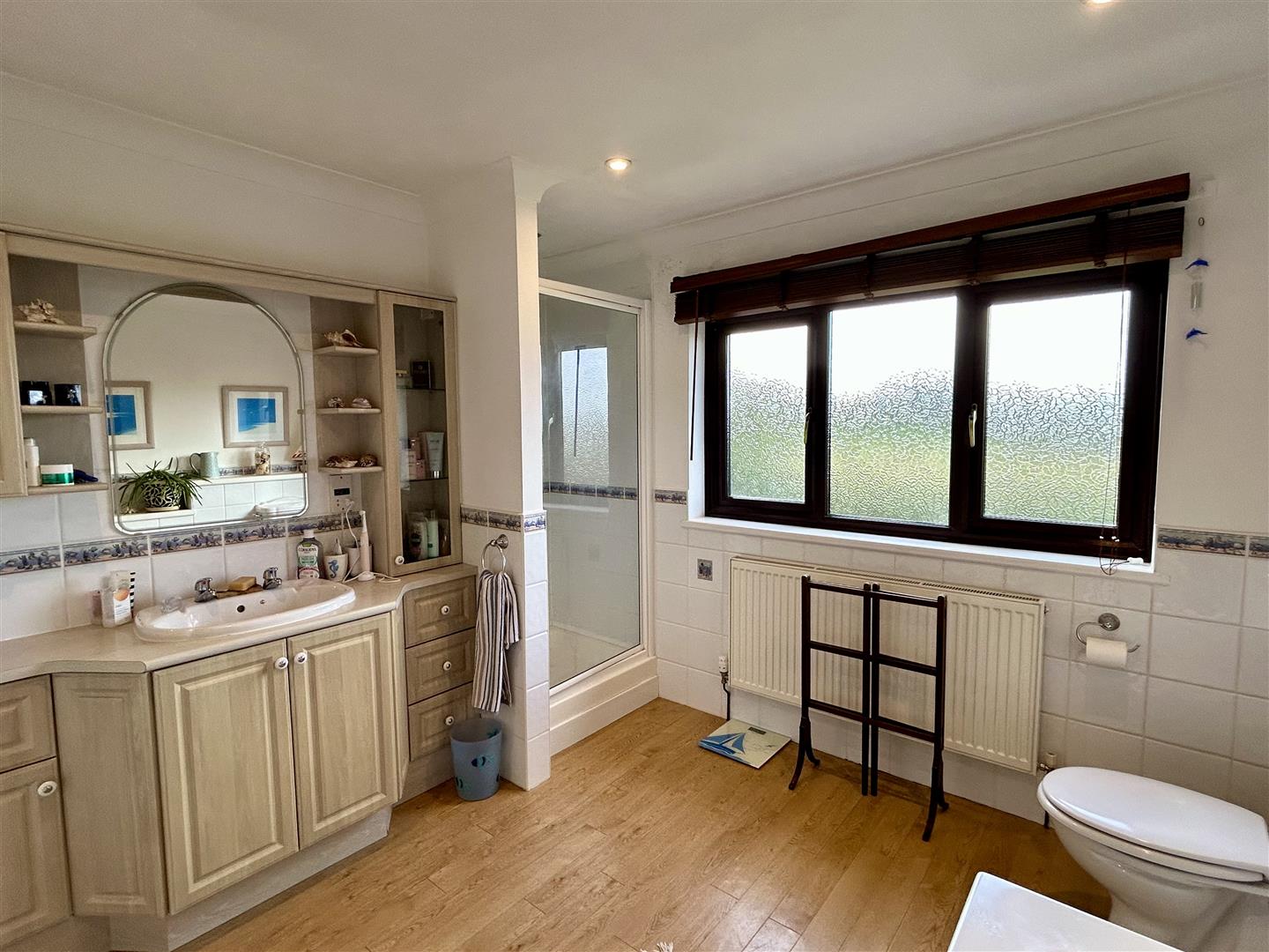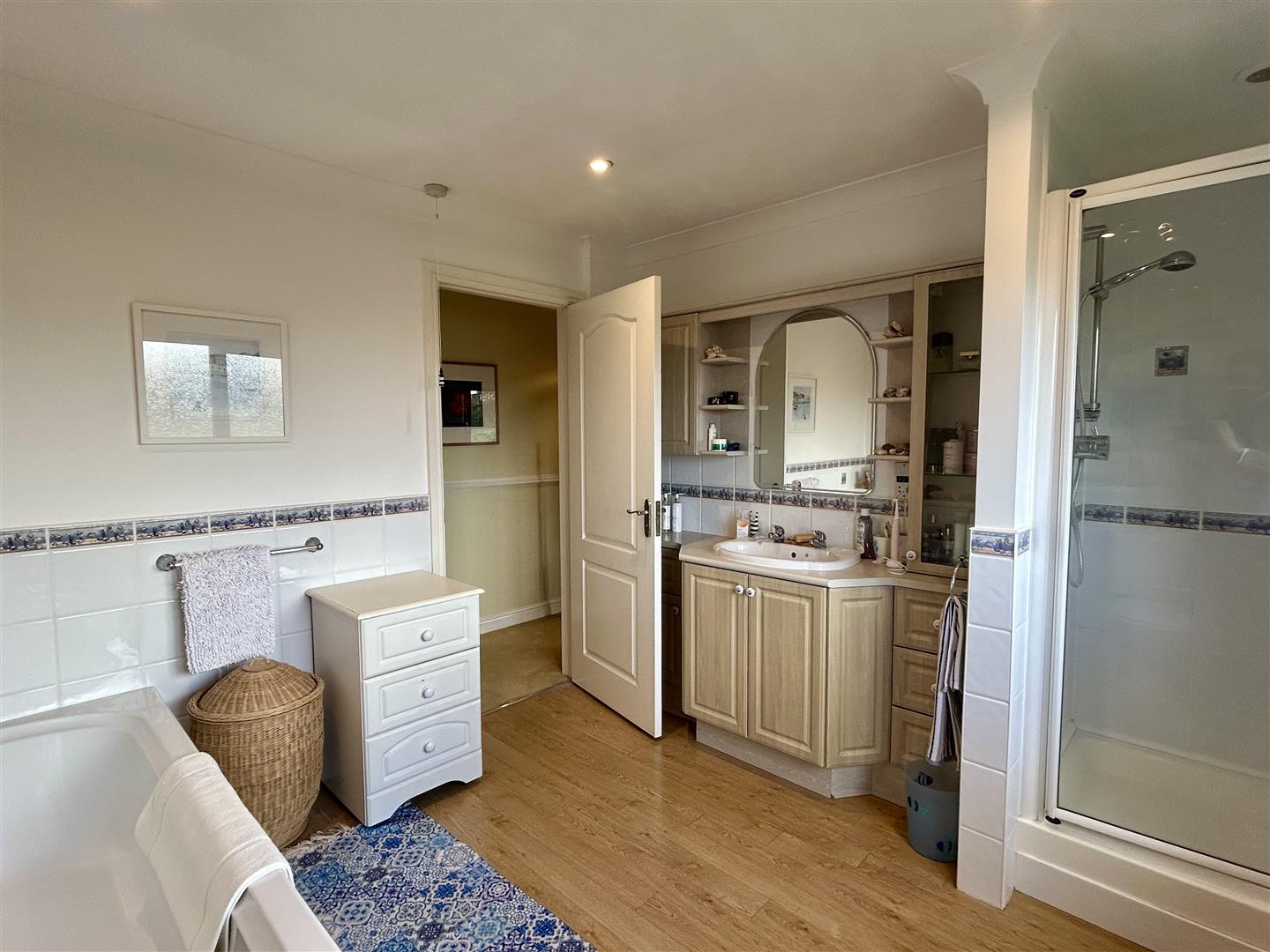 Coving and inset spotlighting to ceiling. Wash hand basin set over vanity storage and drawer units with open shelving, display cabinet, mirror and storage over. Low level W.C. Double ended bath with central chrome taps. Step in enclosure with mains fed shower. Wood effect flooring. Part tiling to walls. Panelled radiator. Opaque UPVC double gazed window to rear elevation.