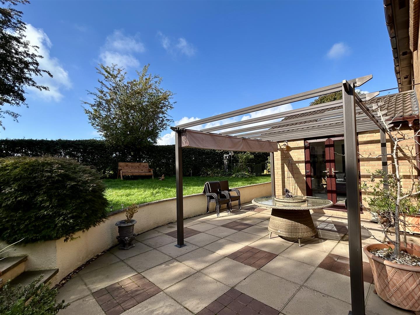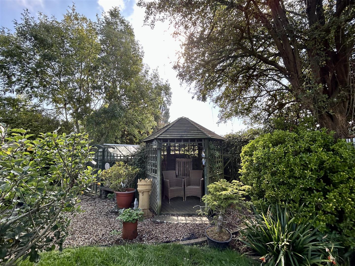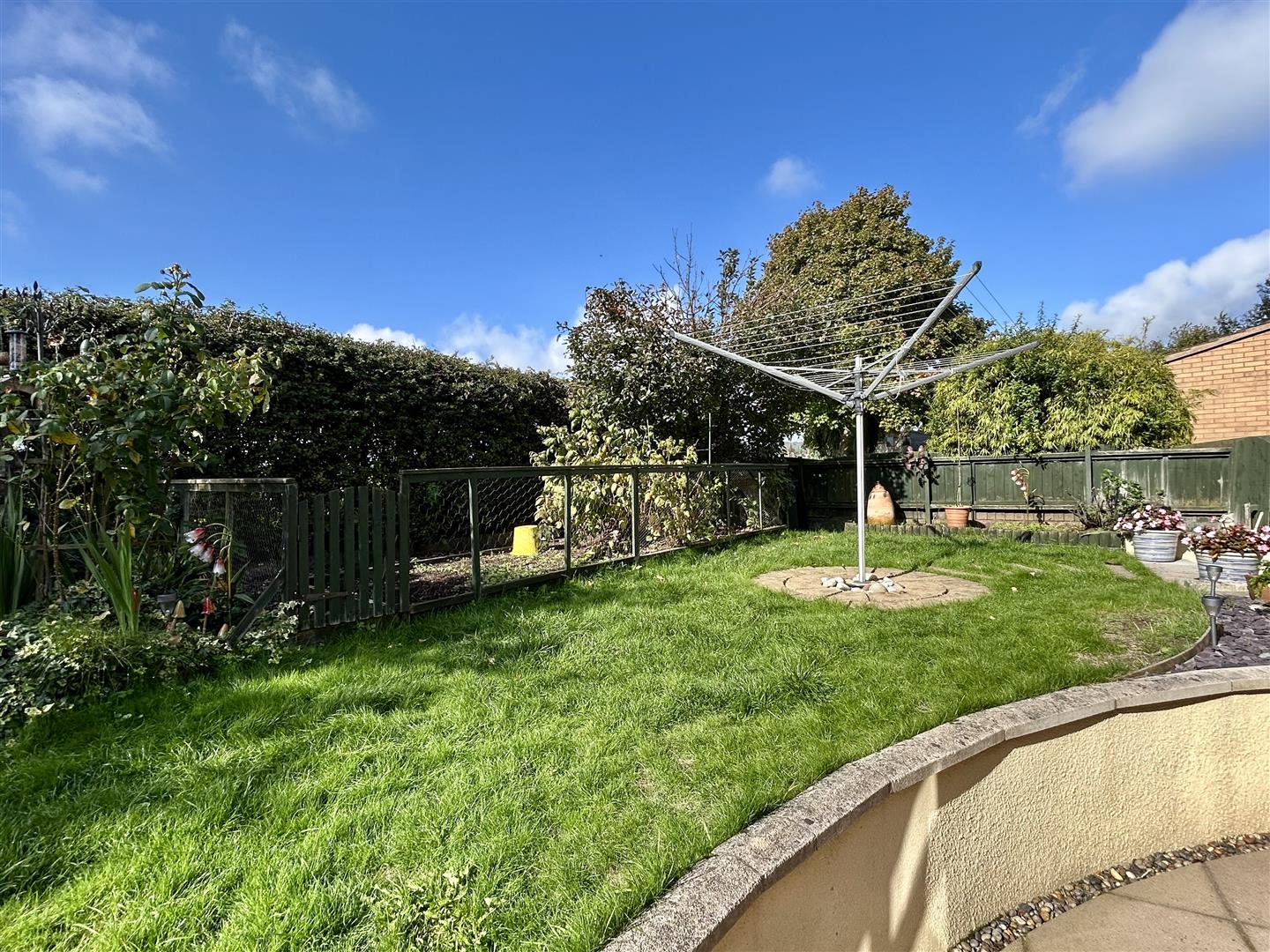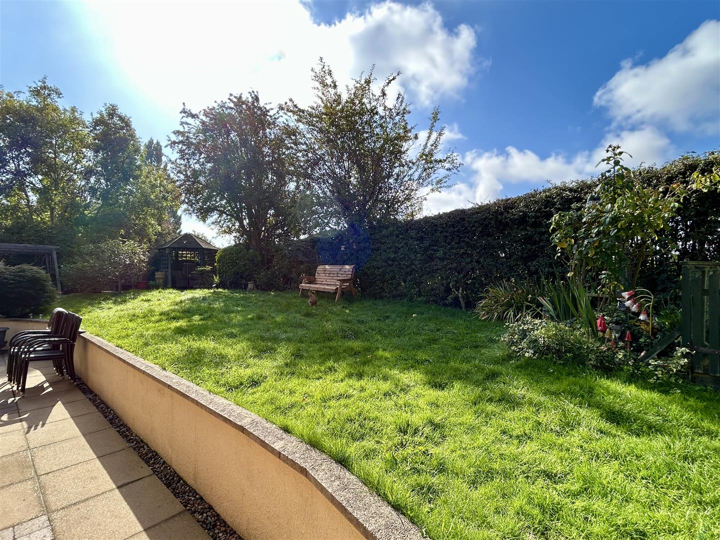 The front garden is mainly laid to lawn, bordered by a variety of mature shrubs providing natural privacy and curb appeal. To the rear, a generous paved seating area offers an ideal space for alfresco dining in the warmer months. The garden is again predominantly lawned, complemented by a range of well-stocked flower beds and borders, featuring mature shrubs, trees, and seasonal planting. A mature hedge encloses the boundary, enhancing the sense of privacy and seclusion.