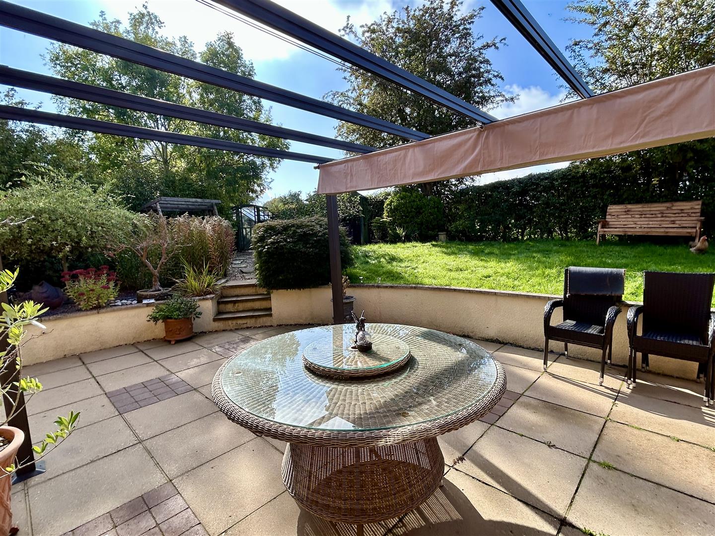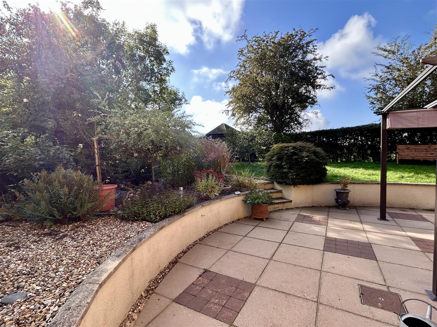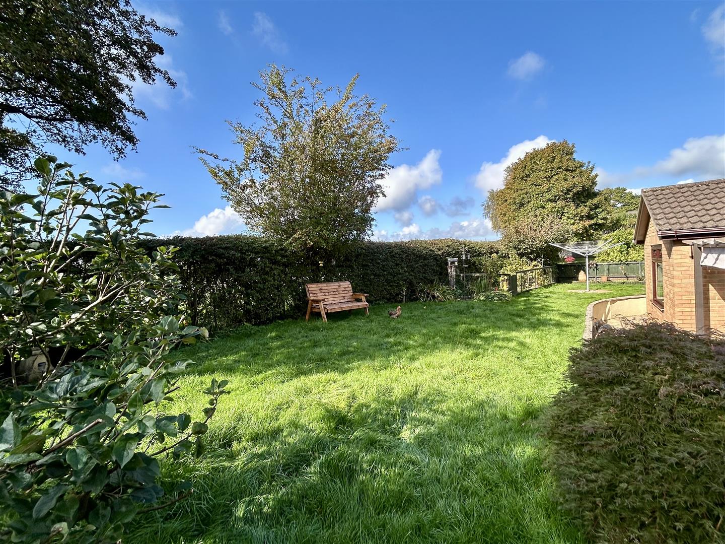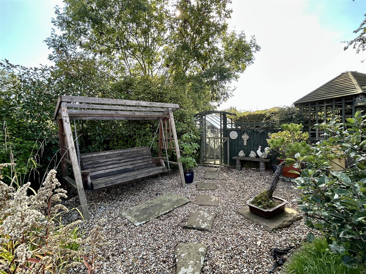 The front garden is mainly laid to lawn, bordered by a variety of mature shrubs providing natural privacy and curb appeal. To the rear, a generous paved seating area offers an ideal space for alfresco dining in the warmer months. The garden is again predominantly lawned, complemented by a range of well-stocked flower beds and borders, featuring mature shrubs, trees, and seasonal planting. A mature hedge encloses the boundary, enhancing the sense of privacy and seclusion.
