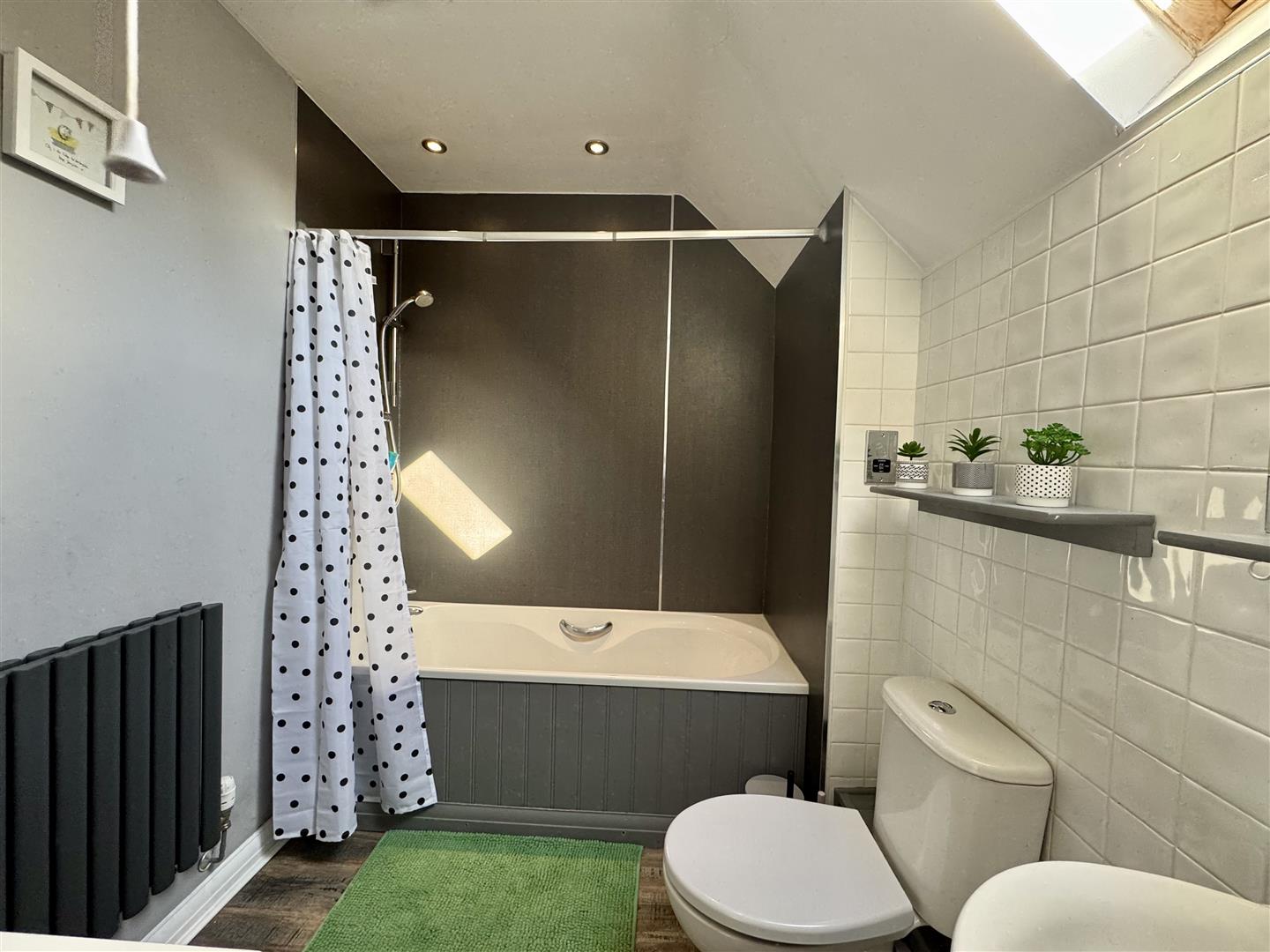 Inset spotlighting and extractor to ceiling. Low level W.C. Pedestal wash hand basin. Bath with mains fed shower over. Part shower panels and tiling to walls. Contemporary radiator. Wood effect flooring. Velux roof window to rear elevation.