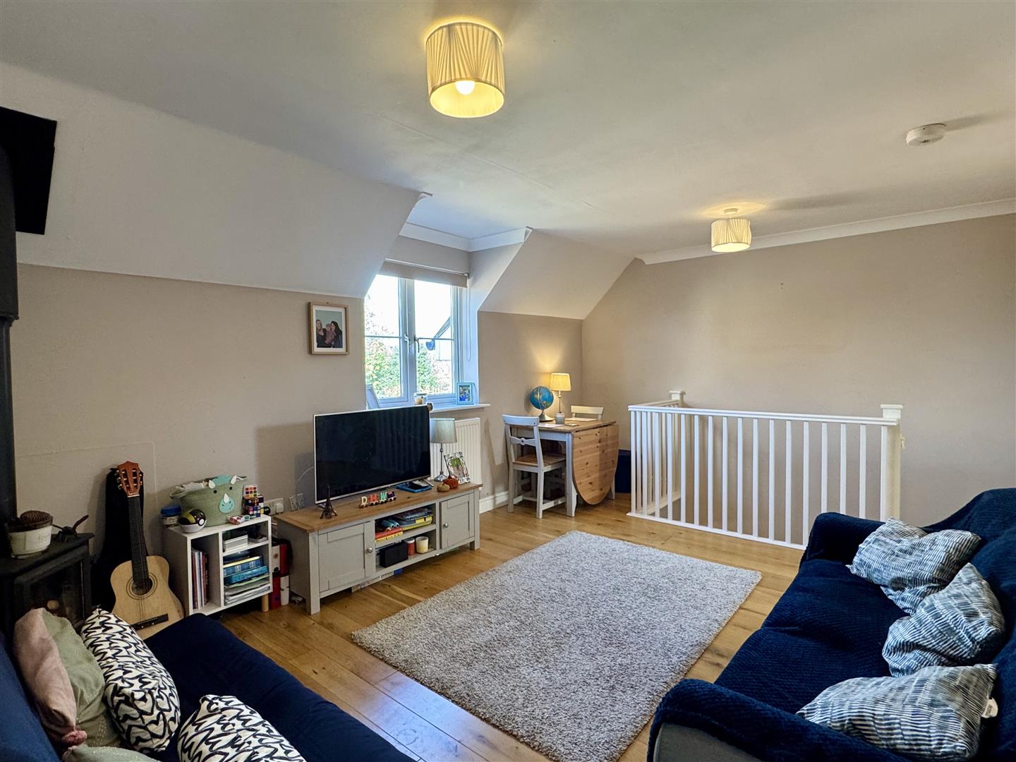 The living room boasts attractive oak flooring and a charming wood-burning stove, opening seamlessly into a modern, fitted kitchen. A door from the living area leads to an inner hallway, giving access to two well-proportioned bedrooms and a stylish, contemporary bathroom.
