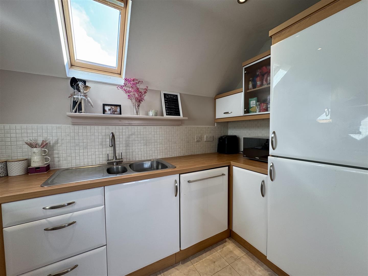 Inset spotlighting to plain ceiling. The kitchen is fitted with a matching range of base and eye level storage units all with wood effect work surfaces and tile splash back. One an half bowl sink and mixer tap set into work surface. Built in double fan assisted electric oven. Four ring gas hob set into work surface with tile splash back and stainless steel extractor hood and lighting over. Built in fridge freezer. Integrated dishwasher. Tile effect flooring. Velux rood window to rear elevation.