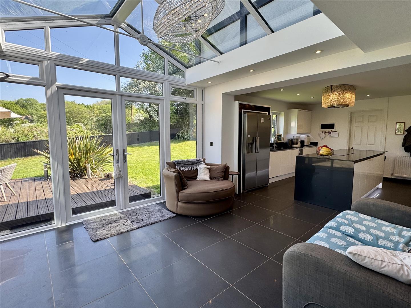 Fitted with a contemporary Wren Kitchen to include a range of high gloss white handless base and eye level storage units with zoned spotlighting. Quartz worksurfaces. One and a half bowl stainless steel sink and mixer tap set into worksurface with complimentary granite upstands. Breakfast island with granite worksurfaces, handless door cupboard and pan drawers. Neff touch control induction hob. Remote controlled, drop down extractor fan and lighting. Twin fan assisted electric ovens and microwave combi. Integrated dishwasher. American style fridge/freezer with drinks and ice dispenser. Porcelanosa tiled floor with zoned under floor heating. Separate wall mounted electric heater and panelled radiator. TV and power point. Recessed ceiling speakers. Open to sun room. UPVC double glazed window to rear elevation. Door to utility room.