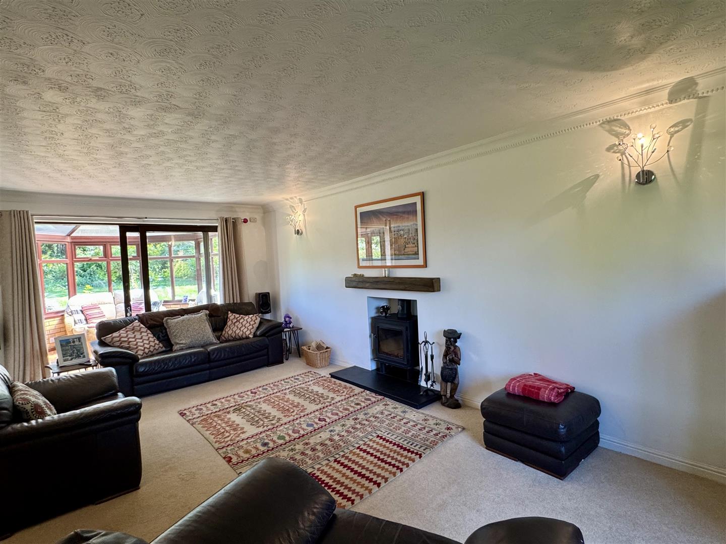Coving. Wrought wood burner with slate hearth and floating lintel. Panelled radiators. UPVC double glazed window to front elevation. Double glazed sliding door to conservatory. Double doors to study.