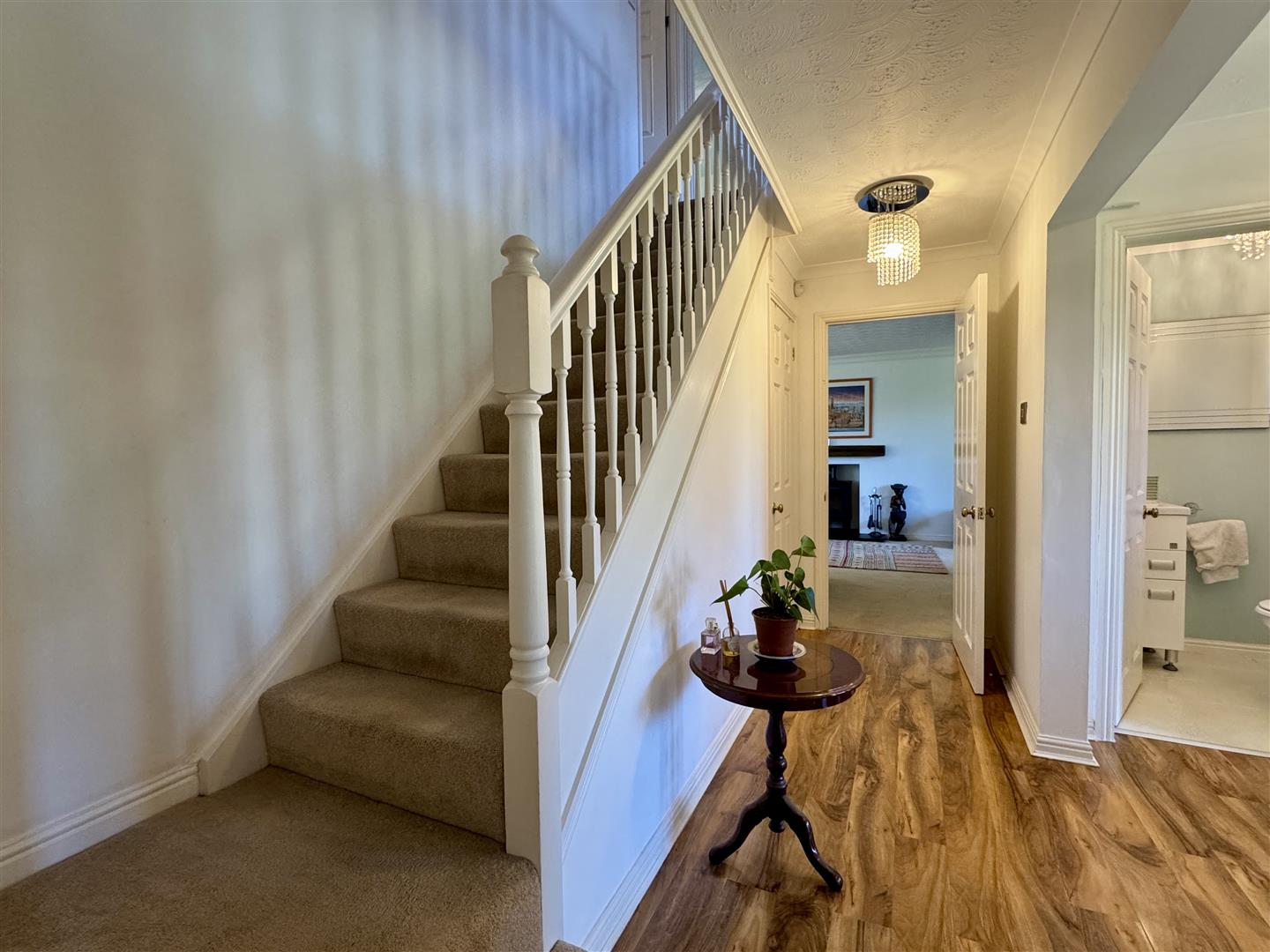 Approached via a generous open porch and glazed and panelled door. Coving. Understairs storage cupboard. Good quality wood effect flooring. panelled radiator. Stairs to first floor landing. Doors off.